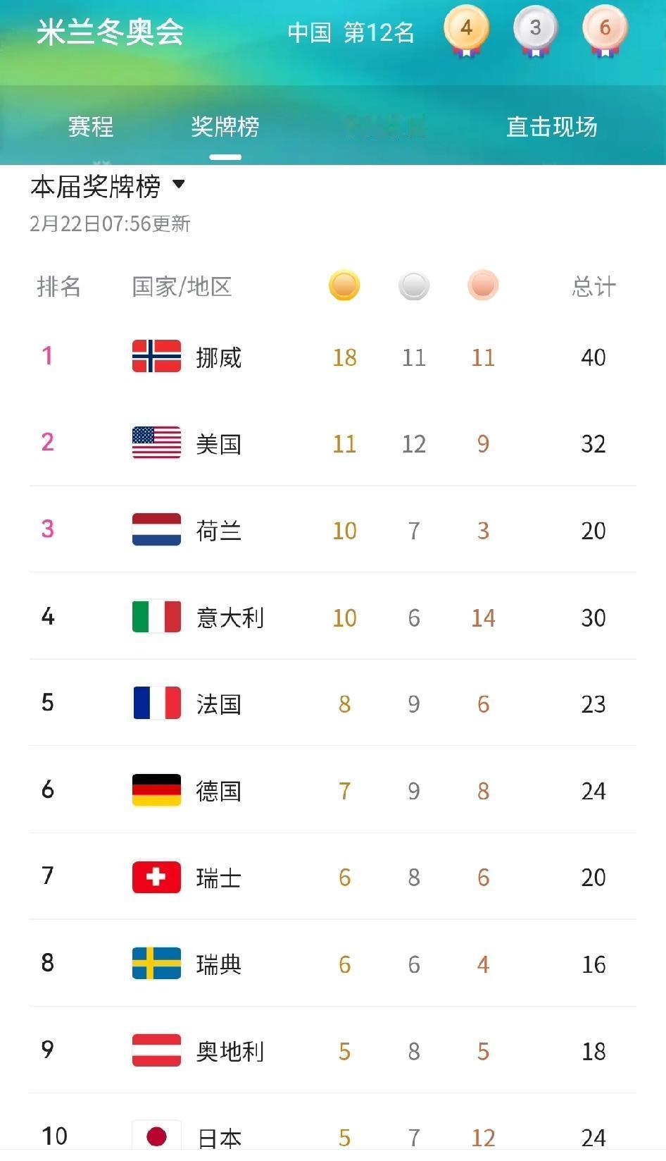 2日22日清晨,米兰冬奥结束第15比赛日,共产生了9枚金牌。挪威选手包揽了越野滑雪男子50公里集体出发的前三,以18金11银11铜在奖牌榜展现极强统治,并且金牌和奖牌数均创造单届冬奥历史新高,其中金牌数更是连续第二天刷新史上最多记录,奖牌数40枚也超越2018昌平冬奥的39枚史上最多记录(挪威保持),不愧为世界冰雪巨人,另外美国、荷兰、意大利、法国也均创造或刷新了各自冬奥史上的金牌记录。 ◆美国意外摘得男女混合团体空中技巧金牌,在奖牌榜以11金12银9铜继续稳固奖牌榜第二的位置,11金也刷新了美国在冬奥史上的夺金记录(盐湖城10金)。 ◆荷兰速度滑冰太强了,本比赛日又收获了速度滑冰男子、女子集体出发的2枚金牌,连续两天收获2金,以10金7银3铜超越东道主意大利的10金6银14铜跃居奖牌榜的第三,金牌总数大幅刷新荷兰冬奥史上的金牌记录(索契、平昌、北京均8金)。 ◆其它5枚金牌归属如下 ▷法国2枚:滑雪登山混合接力、冬季两项女子12.5公里集体出发,在奖牌榜升至第五,继续刷新自己冬奥史上夺金记录(北京、昌平均5金)。 ▷德国1枚:女子双人雪车,包揽金银牌。 ▷意大利1枚:自由式滑雪男子障碍追逐。 ▷加拿大1枚:男子冰壶。