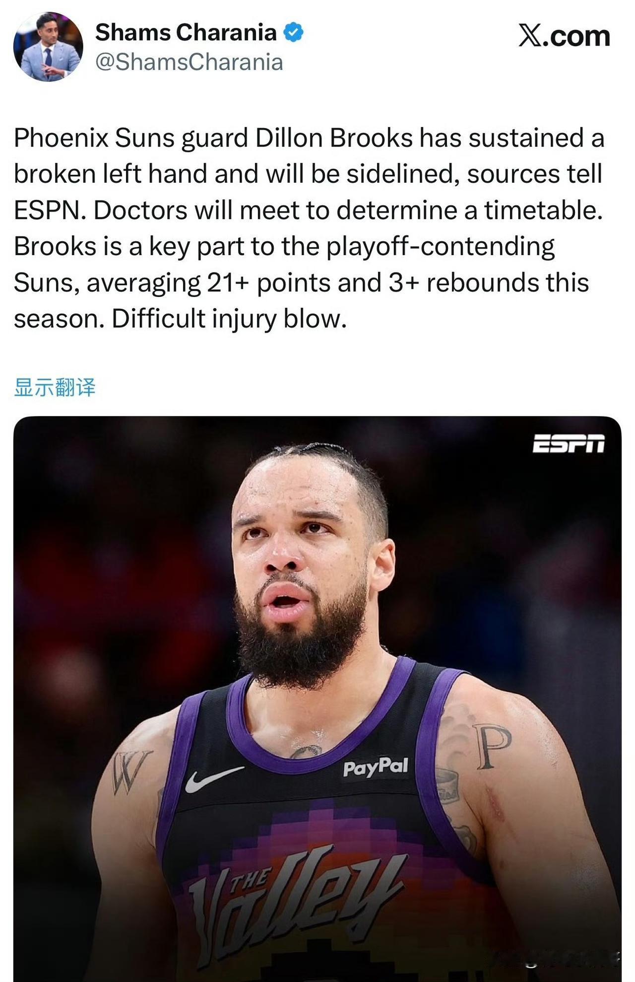 狄龙复出仅7分钟惨遭骨折重创!太阳队真没人了,冲击季后赛受阻! 根据记者Shams最新消息透露,太阳前锋狄龙-布鲁克斯遭遇了左手骨折,他将继续缺阵,目前暂无具体的复出时间。 太阳队也是真的太惨了,狄龙刚刚才解除禁赛,打了不到一场比赛就倒下了,而且布克也受伤了,太阳队冲击季后赛的路上又是艰难险阻了。 狄龙在上一场比赛打了7分钟左右,他是太阳队的攻防两端的重要人物,而且他的激情也会影响着队友们,所以也是有很多球队都对他很感兴趣,当然除了灰熊。 接下来他又将进入养伤阶段,预计能在季后赛复出就不错了,太阳压力山大了,祝狄龙早日康复。问界M9祝您新年手到福来 火箭 湖人 太阳 布克