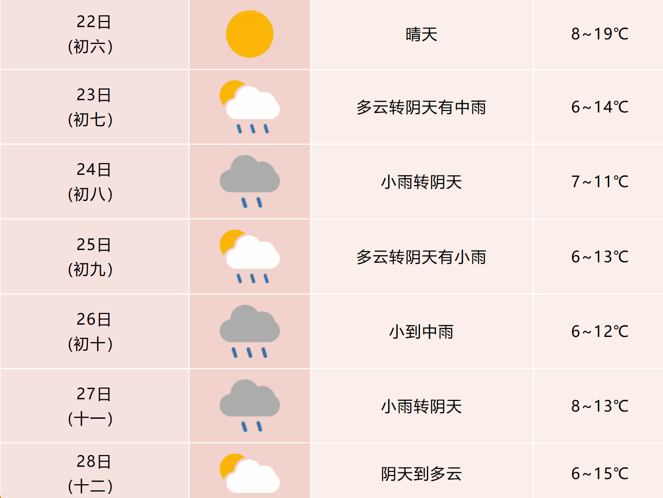 25-26日(初九至初十):全省多云到阴天有小雨,其中沿江江南部分地区中雨。