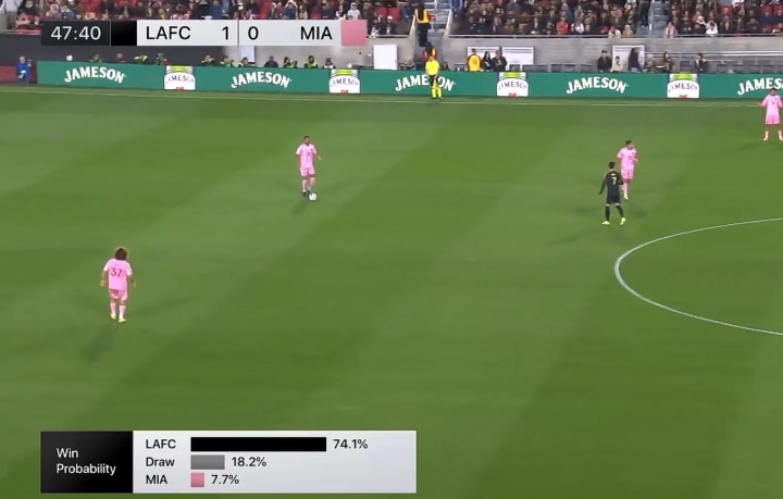 第48分钟转播方给出胜率:洛杉矶胜率74.1%,迈阿密国际仅7.7%
