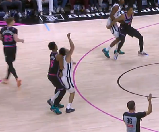 第四节比赛中,小皮蓬投进三分后被加德纳身后推倒,随后小皮蓬回防中直接发力推搡加德纳,两人抱摔倒地。