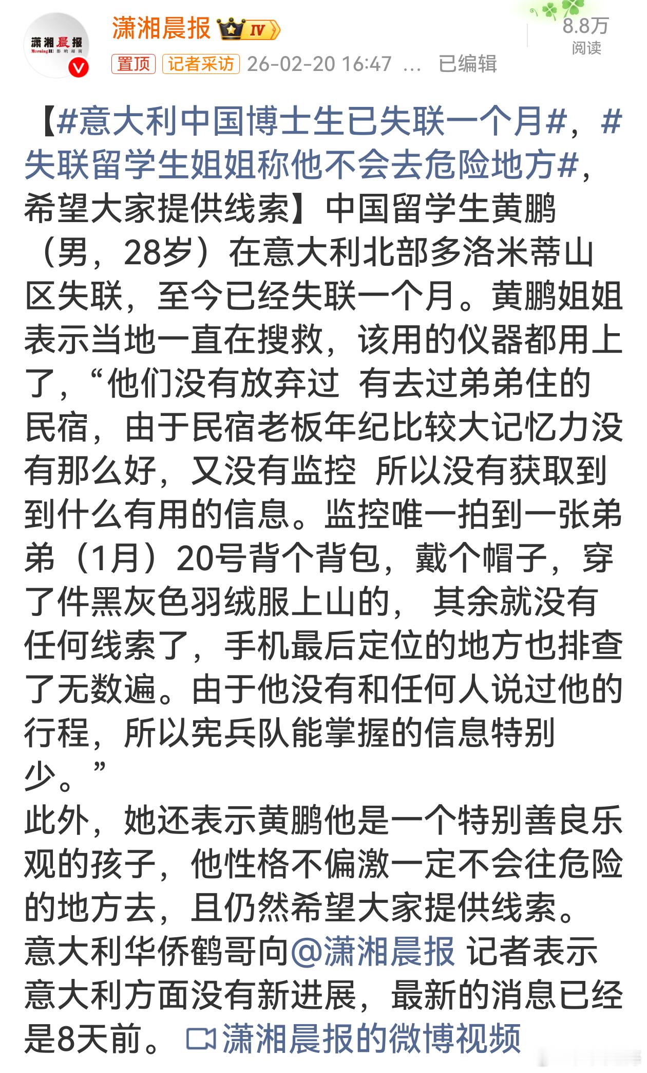 意大利中国博士生已失联一个月28岁中国博士生黄鹏在意大利山区失联已一月,当地虽全力搜救却进展甚微。监控仅拍到他上山身影,手机定位处也反复排查无果。姐姐称其善良乐观,不会涉险。如今信息有限,希望社会各界能提供线索,助其早日回家。