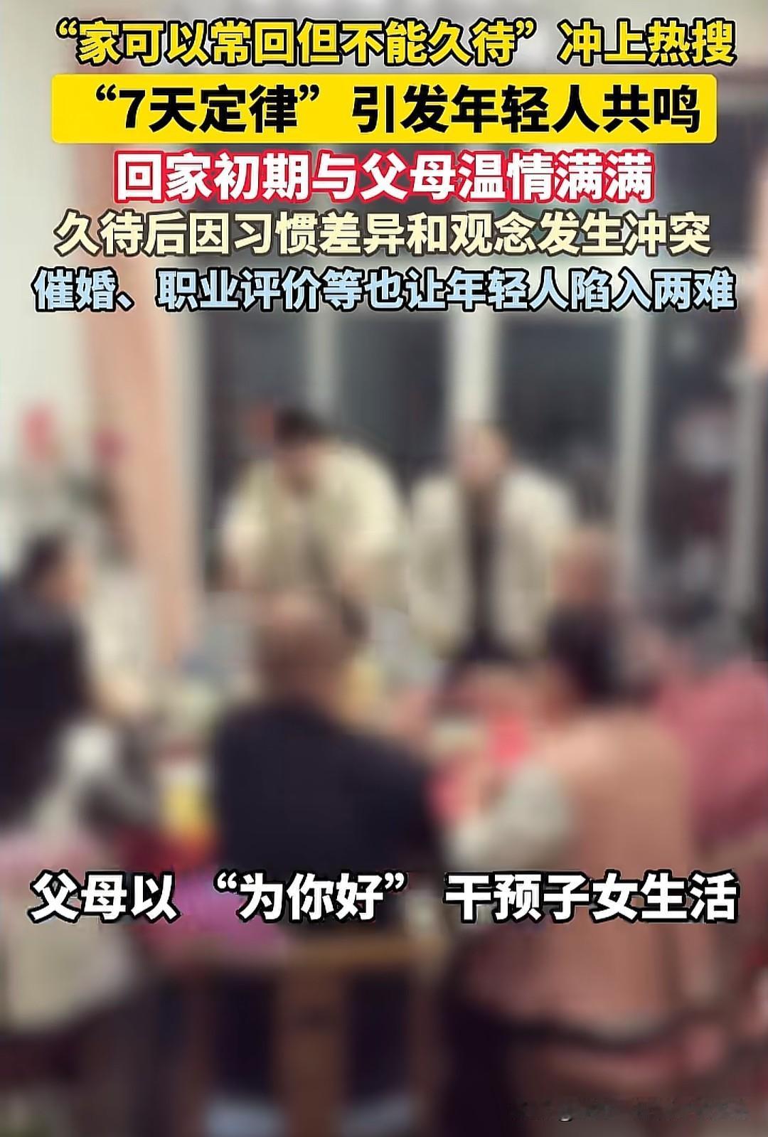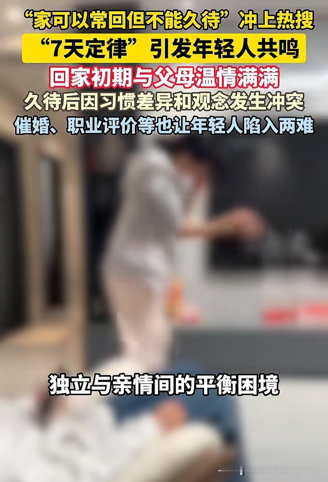 "家可以常回但不能久待"突然冲上热搜,一句简单的感慨戳中了无数年轻人的软肋。所谓"7天定律"——回家初期与父母温情脉脉,一周后却因生活习惯、观念差异陷入冲突,催婚、职业评价等话题更是让团聚变成"甜蜜的负担"。这种"近乡情怯"的矛盾,折射出当代年轻人在独立与亲情间的艰难平衡。 我们这代人似乎活成了"候鸟":远方有职场理想,故乡有父母牵挂。刚回家时,妈妈会把冰箱塞得满满当当,爸爸会默默修好你房间松动的衣柜门,那种被珍视的温暖足以融化所有疲惫。可没过几天,"几点了还不睡""工资多少""啥时候结婚"的灵魂拷问就会如期而至。不是父母不爱,而是他们习惯用自己的人生经验规划你的道路;不是我们不孝,而是在大城市打拼出的价值观,早已和故乡的生活逻辑产生了微妙的错位。就像那位失联一年的儿子,或许也曾在类似的代际张力中,选择用沉默对抗沟通的无力。 更深层的矛盾在于,我们和父母活在两个"平行世界"里。他们的安全感来自稳定的工作、早婚早育的传统路径,而我们的焦虑则藏在"35岁职场门槛""房价收入比"的现实压力中。当妈妈说"考个公务员稳定"时,她不懂你在互联网公司996的挣扎;当爸爸批评"你那工作不像正经职业"时,他无法理解自媒体、电竞这些新兴行业的价值。这种认知差,让"为你好"的关心变成了"被冒犯"的干预,让本应温馨的家,成了需要小心翼翼维持的"社交场合"。 有人说这是"不孝",但更多年轻人在"逃离"背后藏着深深的无奈:我们既想成为父母的骄傲,又不想放弃自我的追求;既渴望家的温暖,又害怕被熟悉的环境"吞噬"。或许,"常回不能久待"不是答案,而是当代家庭关系的某种妥协——就像给情感设置一个"安全距离",让爱不至于在琐碎的摩擦中变质。
