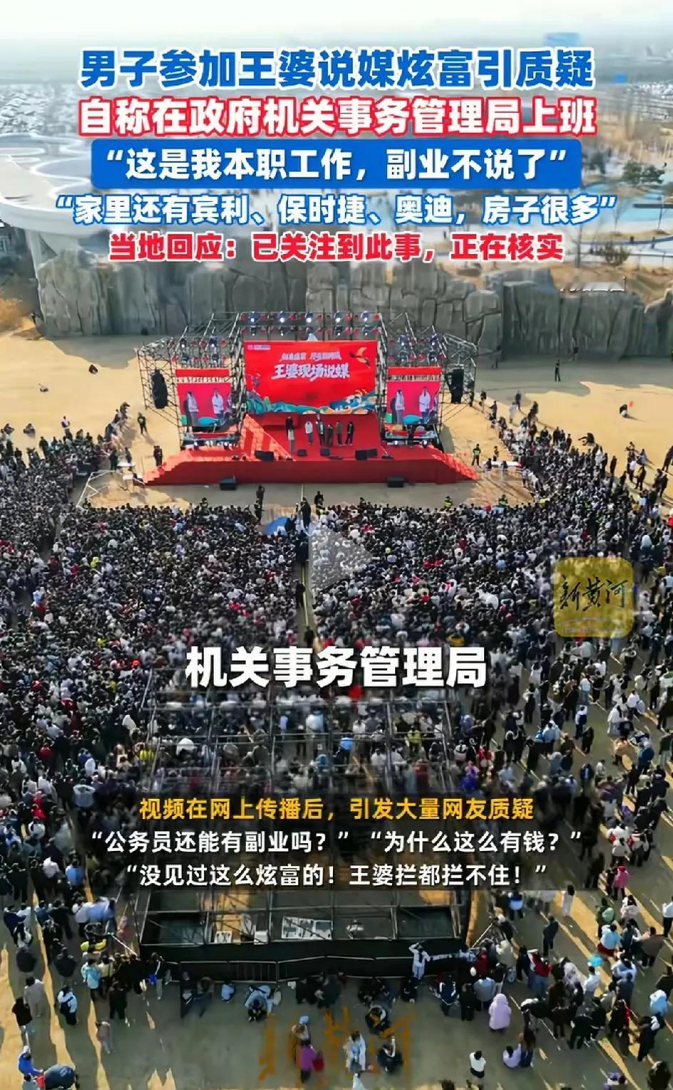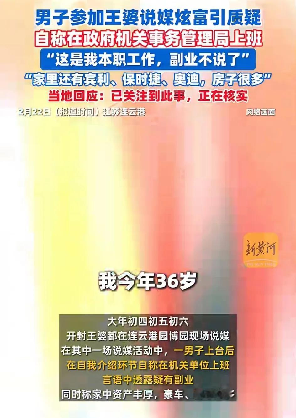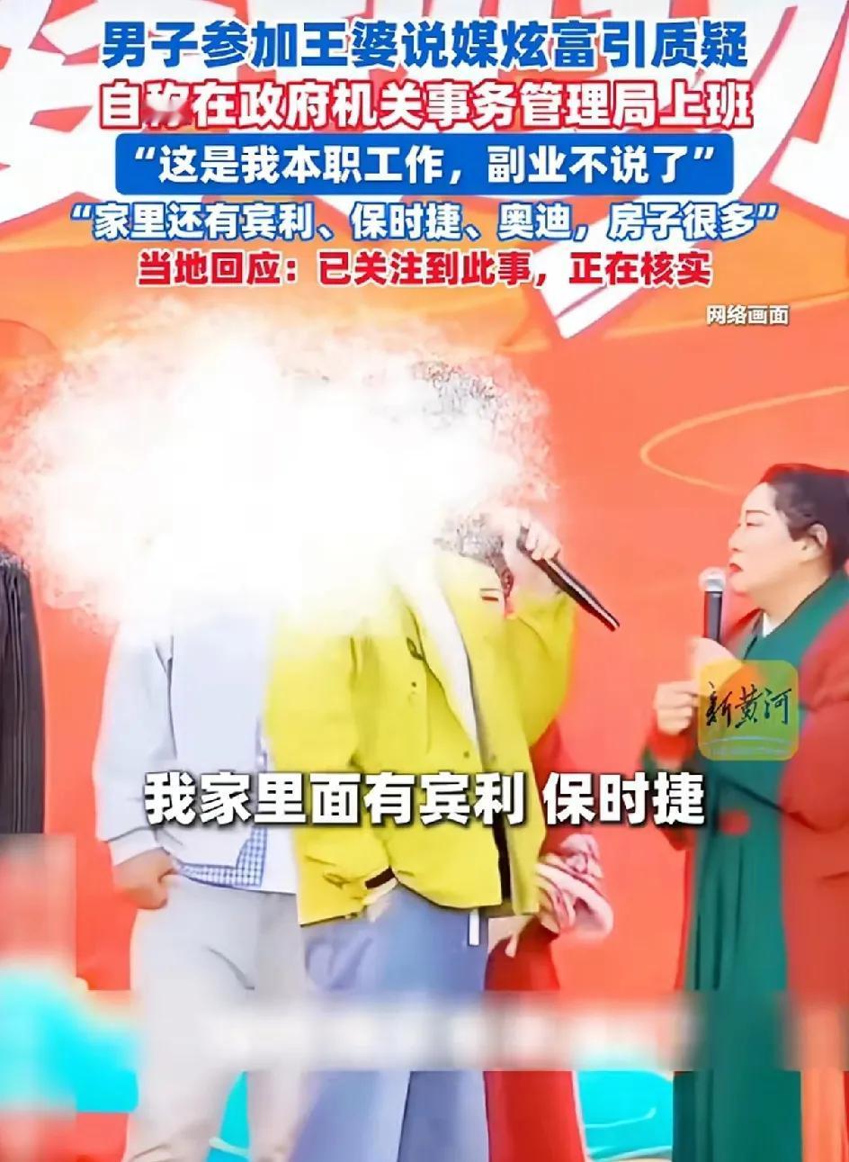 连云港男子自称公务员,在参加王婆说媒的节目当中炫富。说我的本职工作机关事务管理局,但我的副业就不说了,我家里有宾利,保时捷,奥迪房子很多套。我今年三十六岁。 网友说没见过这么明目张胆,在大庭广众之下炫富的,王婆拦都拦不住。 如果他的钱是正规渠道来的,也无话可说,大家无非只是羡慕罢了。炫富可能也是他的高调的做人的风格。如果钱来的不干净,也不敢炫富吧。但是也不排除吹牛。