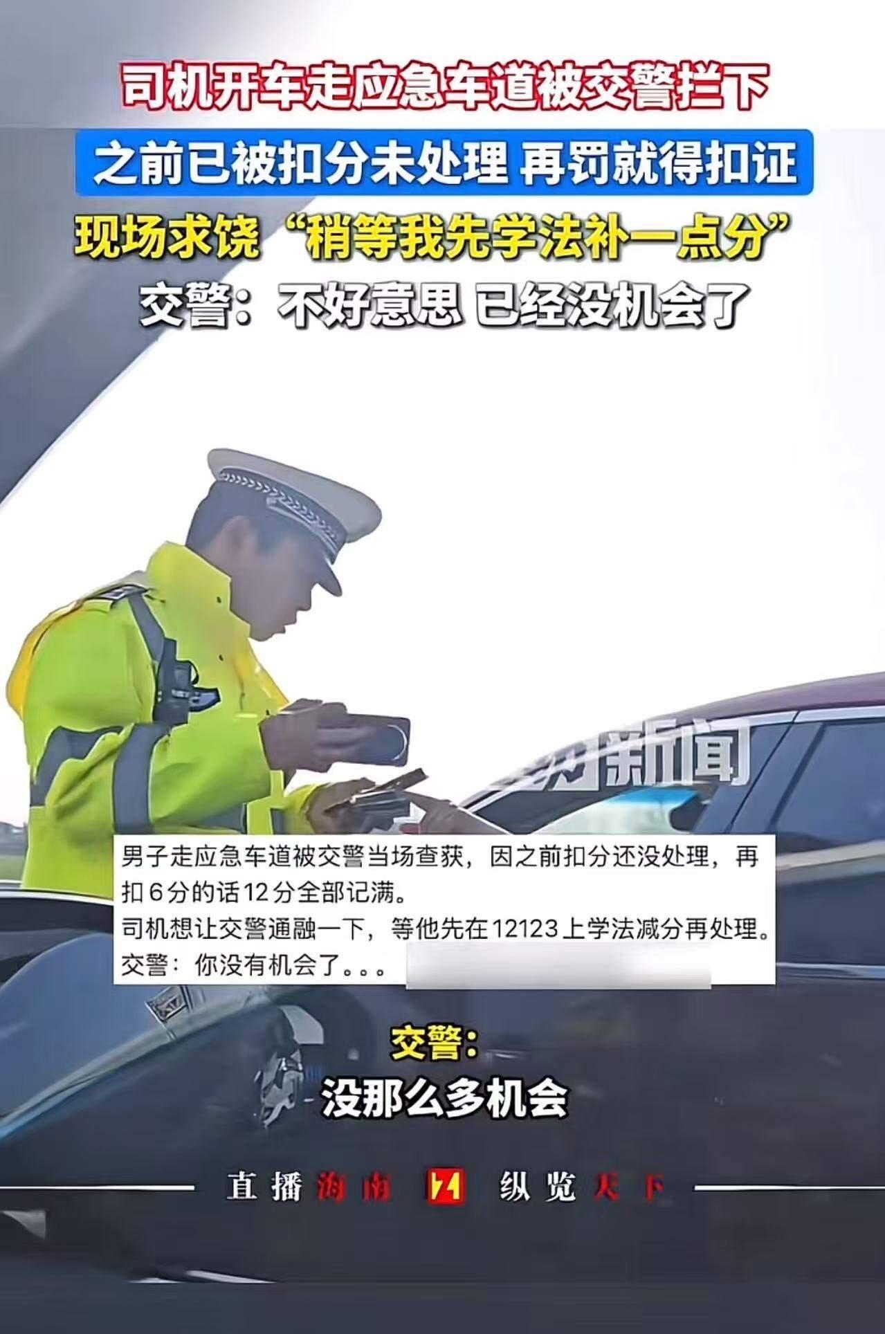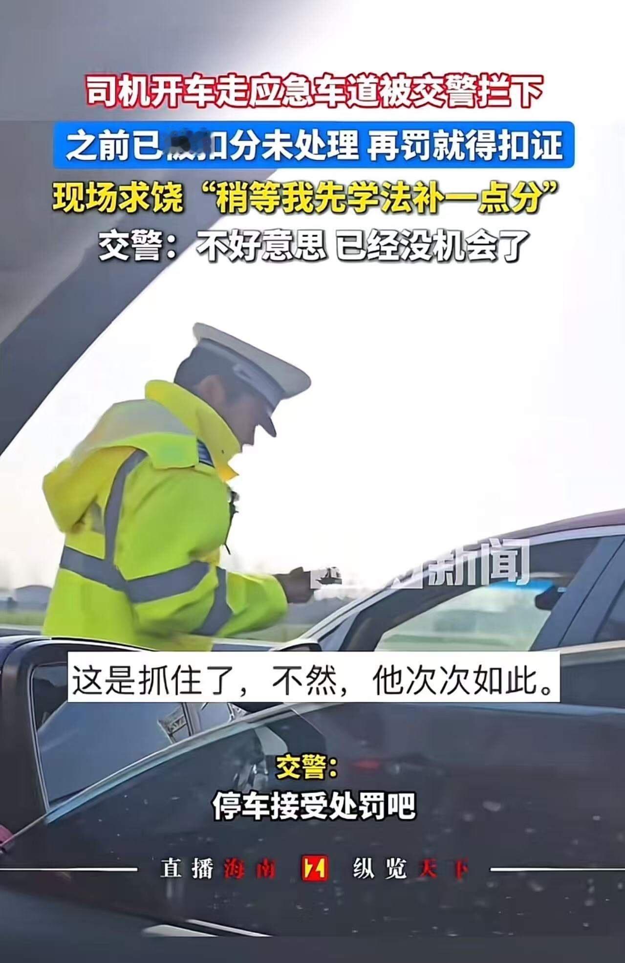 “这个交警太霸气了!”男子开车走应急车道被交警拦下,因为之前与及被扣分未处理,再罚就得扣证。于是求饶:“能不能让我先学法补一点分,不然我就不能开车了……”交警:“不好意思,你已经没有机会了!”网友:干得漂亮!这是抓住了,不然他次次如此! 这件事一经曝光,立刻引发了网友们的热烈讨论。走应急车道,这本就是交通法规中明令禁止的“重灾区”行为,不仅扰乱正常交通秩序,更直接威胁到紧急救援车辆的通行安全。可偏偏总有人抱着侥幸心理,以为走走应急车道没什么大不了,殊不知这背后隐藏的是对法律的蔑视和对他人生命安全的漠视。 更让人气愤的是,这位男子此前已经因为多次违规被扣分,却迟迟不去处理,眼看着自己的驾驶证即将被吊销,依然我行我素。这种“屡教不改”的态度,正是导致交通事故频发、道路安全隐患加剧的重要原因。 而这位交警的“霸气”执法,正是对这种侥幸心理的一记有力回击。没有任何“通融”的余地,没有任何“特殊”的待遇,只有严格的制度和铁的执行。这不仅是对违法者的警示,更是对所有守法驾驶人的保护。 网友们纷纷点赞:“就是要这样,不能心软!”“每次看到有人走应急车道,我都气得不行,这下终于有人管了!”“法律面前人人平等,别让规则成为摆设!”这些声音背后,是广大市民对公平正义的渴望和对交通安全的重视。 这起事件也让我们深刻反思:面对法规,我们是否真正做到了尊重和遵守?当规则成为“可选项”,社会秩序和公共安全又该何去何从? 或许,正是因为有了这样“不讲情面”的交警,才让那些“违法者”无处遁形;正是因为严格执法,才让我们的道路更加安全;正是因为不放纵,才让社会向着更加文明和谐的方向前进。 那么,作为普通驾驶人,你又是如何看待“走应急车道”这种行为的?面对违反规则的“老手”,你是否也希望有更多像这位交警一样的铁腕执法?欢迎留言分享,让我们共同为营造一个安全、有序的交通环境出谋划策! 毕竟,安全无小事,谁都不想成为那场“本可以避免”的事故中的受害者。让我们一起支持严格执法,让规则不再是“摆设”,让每一条道路都成为安全之路!交警温情放行 应急车道让行 应急车道停车 交警搞笑 交警拦下学生 应急车道规则 交警楞住