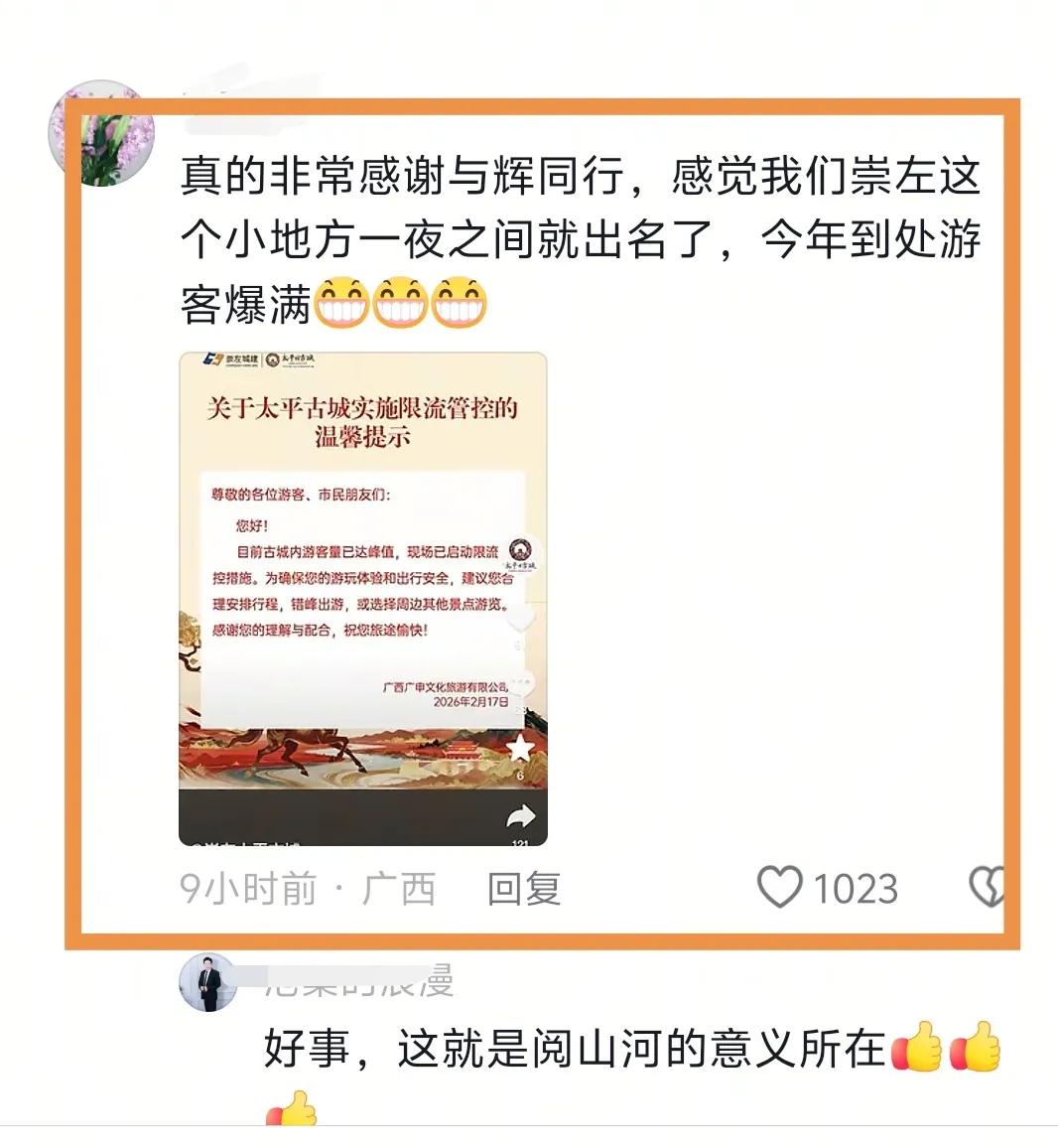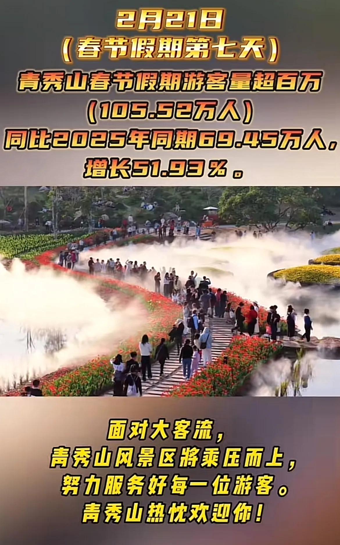 董宇辉的与辉同行阅山河带给广西的爱,在春节旅游黄金周发酵了,大年初六,最新的数据已经亮瞎了全国人民的眼。 在整体数据没有结束前,有几个亮点非常夸张。一是南宁青秀山,大年初一入园20万,排名全国前三。北海的航班数量暴增47%,涠洲岛每天的航班载客人数突破2万。崇左太平古城限流,崇左的热度值排到全国前列。 这一次广西三个小众旅游景点的爆发,得益于1月份董宇辉的广西行。很多丈母娘说来广西这是因为看了阅山河,才有了去崇左和涠洲岛的想法,在这之前,他们并不知道崇左的白头叶猴保护基地,也不知道涠洲岛竟然还有鲸鱼。董宇辉用他的大流量宣传正能量,为广西人民做了踏踏实实的宣传。广西秀丽的山水,适宜的的春节气温,犹如盛夏绽放的鲜花,是董宇辉总结中的广西春节游的亮点。这些都抓住了全国游客的心。 最近这一年,董宇辉三赴广西,不负广西人民对他的盛情邀请,他的山歌唱出了真情,广西人民也投桃报李,对他呵护有加,在他的助力下,广西文旅快马加鞭,成绩斐然。
