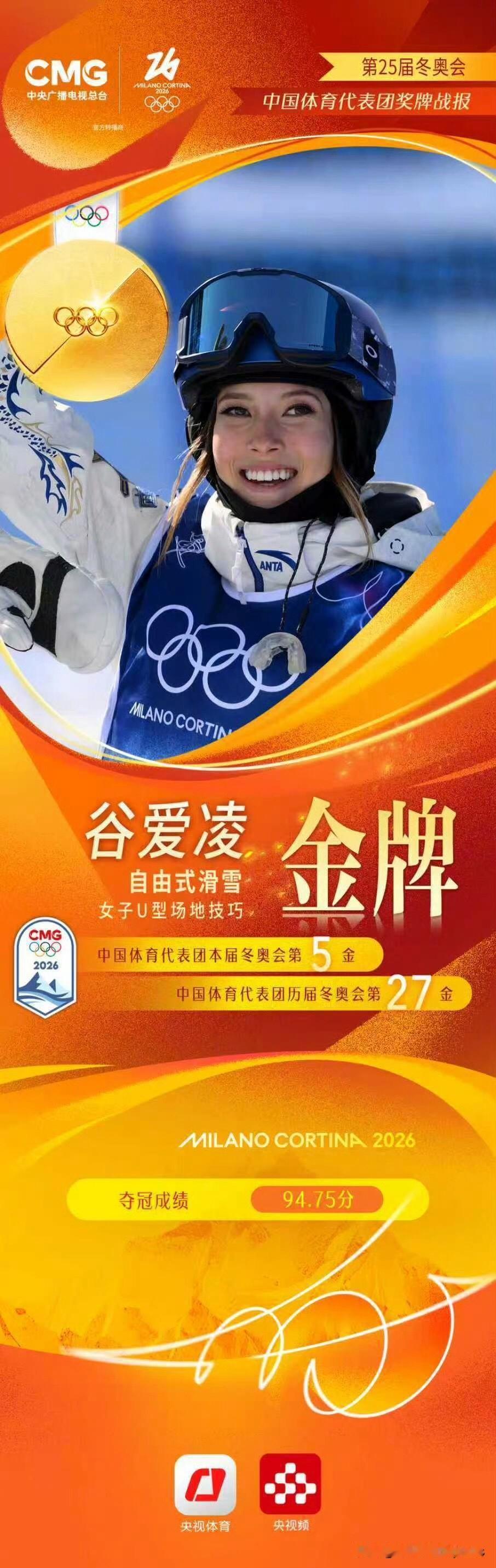 成功卫冕!米兰冬奥会自由式滑雪女子U型场地技巧决赛,谷爱凌在第一滑失误的情况下,第二、第三滑发挥完美均得到高分,其中第三滑获得94.75分的高分,拿到金牌,卫冕成功!另一位中国选手李方慧同样发挥出色,第三滑成绩提升到93分,获得银牌,中国选手包揽金银牌![打call][打call]