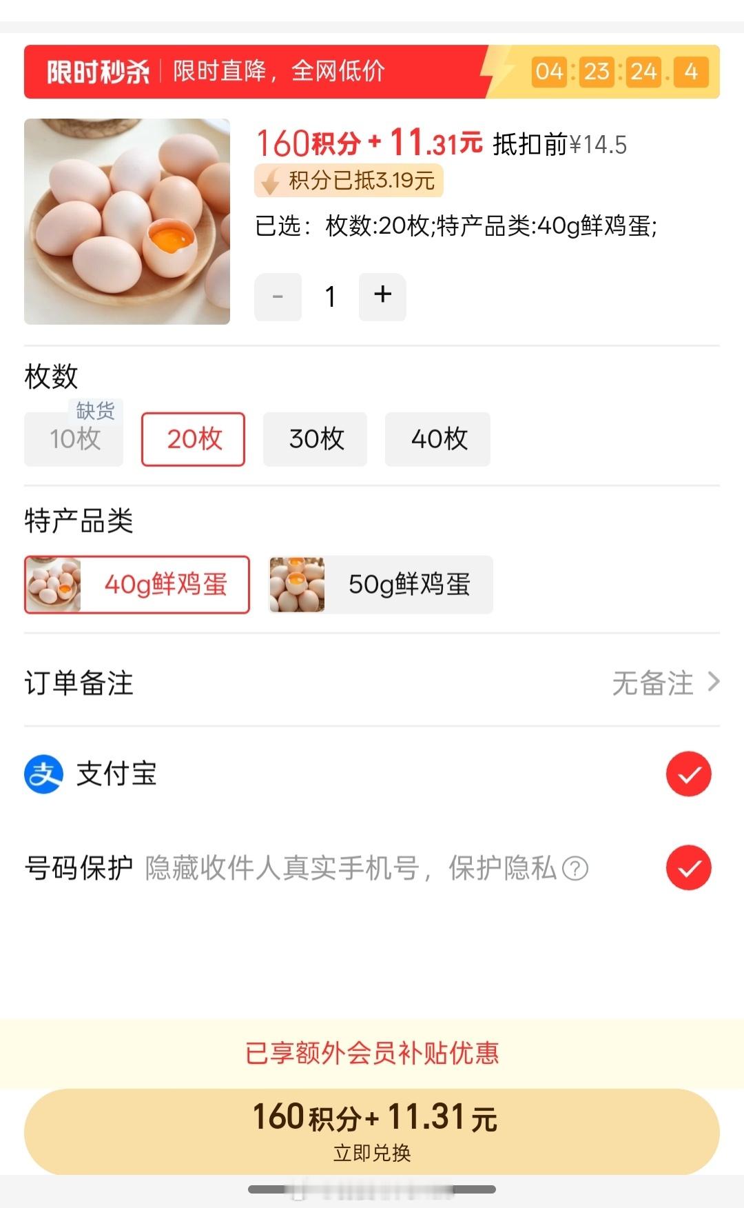 在支付宝积分+钱兑换商品的时候一定要注意,比如这款鸡蛋,标题写50枚,实际标注的价格是20枚到价格,而且规格里最多只有40枚,根本没有50枚的规格选项。支付宝积分兑换