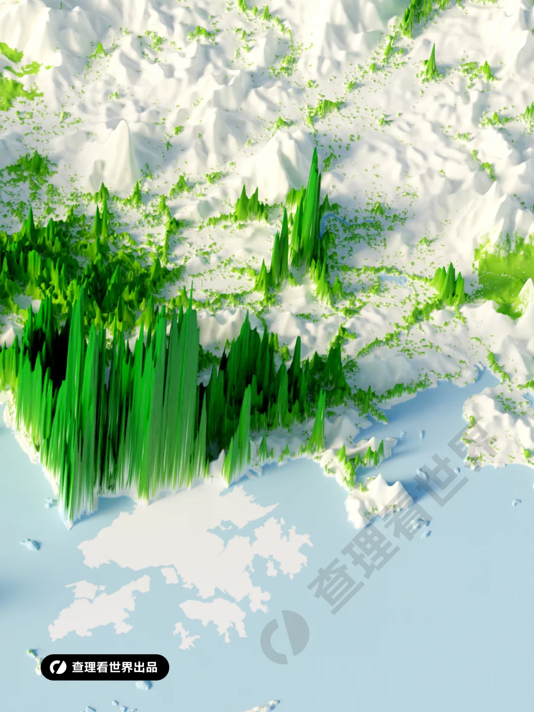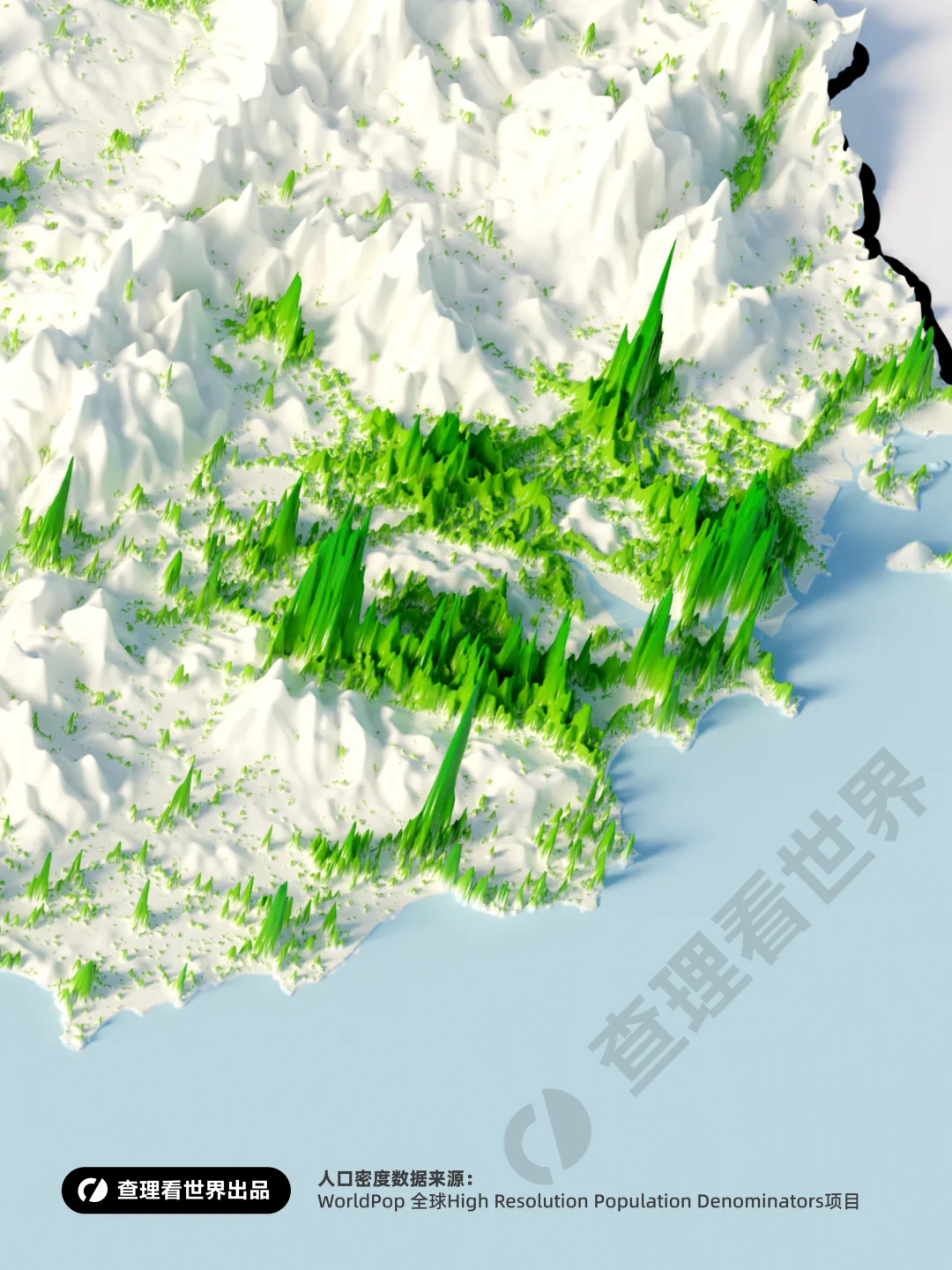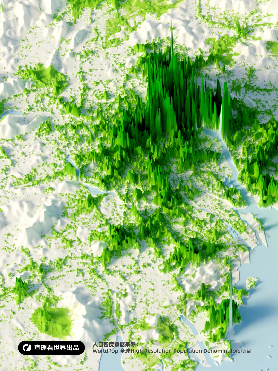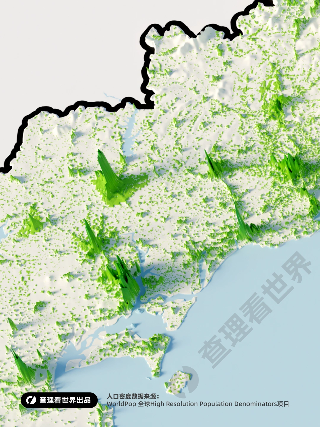 这张人口密度的可视化地图,可能会打破你对广东地理的传统认知。虽然我们常说广东是人口第一大省,但当你把 1.2 亿人放进 17.97 万平方公里的土地上,并用 3D 柱状图表现出来时,你会发现:广东的人口分布,并不是平铺的,而是长出了险峻的“高山”。