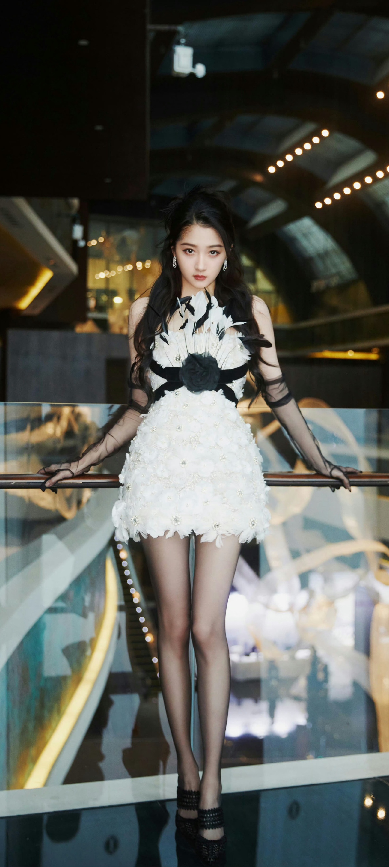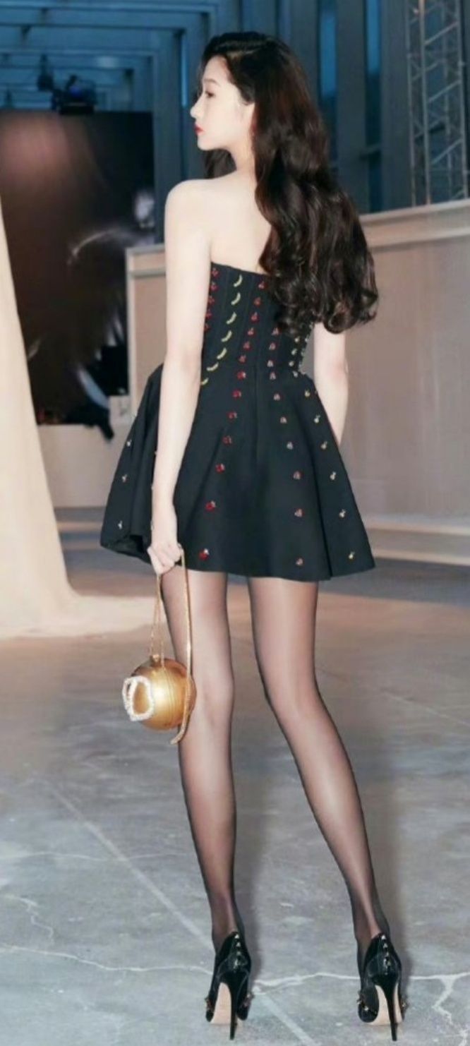 关晓彤黑色系穿搭壁纸,大长腿配丝袜穿搭又酷又美。