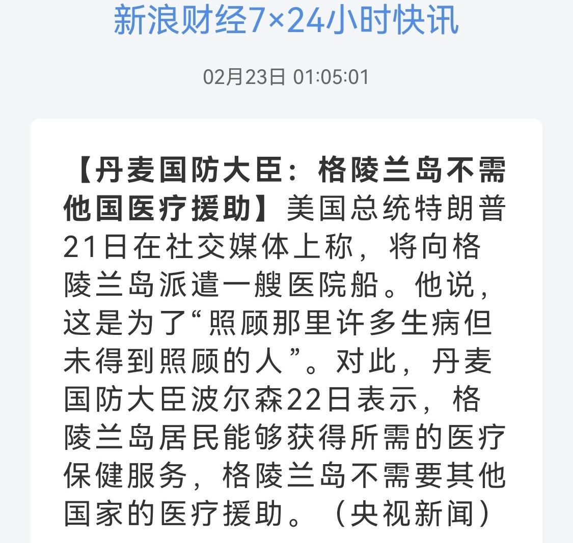 格陵兰岛需要医疗船 老小孩特朗普思路清晰 格陵兰岛危机 美国总统特朗普21日在社交媒体真实社交上发文,将与路易斯安那州州长杰夫·兰德里合作,向格陵兰岛派遣一艘大型医疗船,为当地许多生病却未得到妥善照顾的人提供医疗服务。 央视新闻报道,22日格陵兰岛自治政府总理延斯﹣弗雷德里克·尼尔森表示,他已留意到相关事件。美方应摒弃在社交媒体上随意发表无关紧要言论的做法,先与格陵兰岛进行正式且有效的沟通。而丹麦国防大臣波尔森表示,格陵兰岛居民能够获得所需的医疗保健服务,不需要其他国家的医疗援助。 又一场过家家的游戏!不过以美国的强大军事、政治经济实力,有能力游戏世界各国。只不过这回又一次将脏手伸向了盟友。烽火戏诸侯,现代版演绎,好莱坞式表演。 抢夺格陵兰岛之心,由来已久,昭然若揭,只不过这次的手段太轻浮,盟友的玻璃心不知道碎了几回,你还不如派军队直接占领了呢,丛林法则,盟友都懂。你这样行事,就像让欧盟的北约高官直接叫“Daddy”一样,悲哀啊! (图片源自网络侵权告知删除)