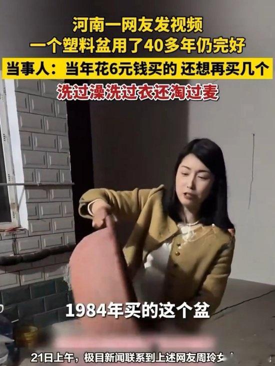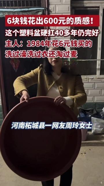 6元塑料盆用了41年仍完好!塑料盆 近日,一网友发视频称,1984年买的6元塑料盆成“传家盆”,质量真的好,用了41年都没坏,也不知道厂家还在不在,想再买几个。当事人:该盆洗过澡、洗过衣、还淘过麦。