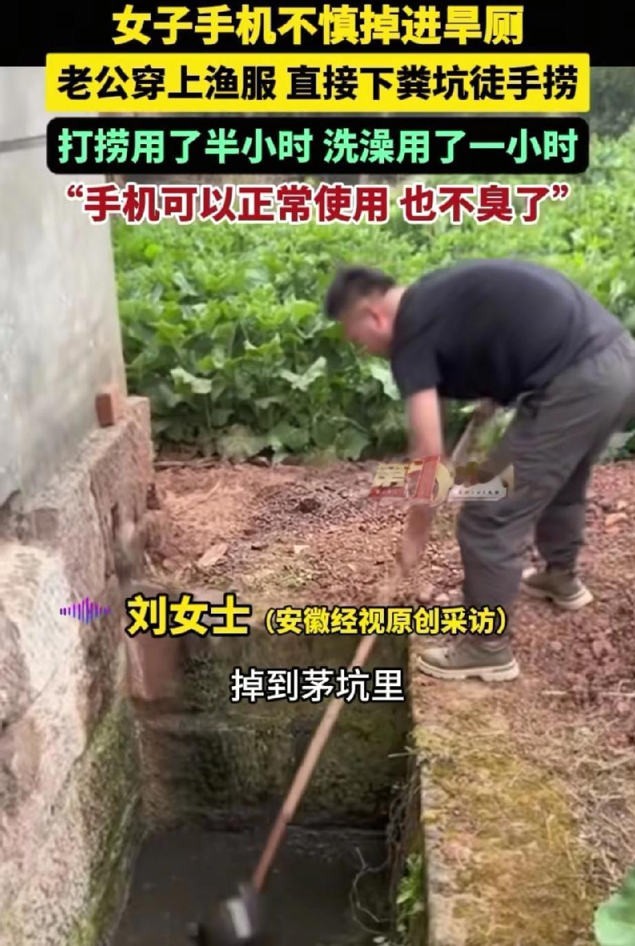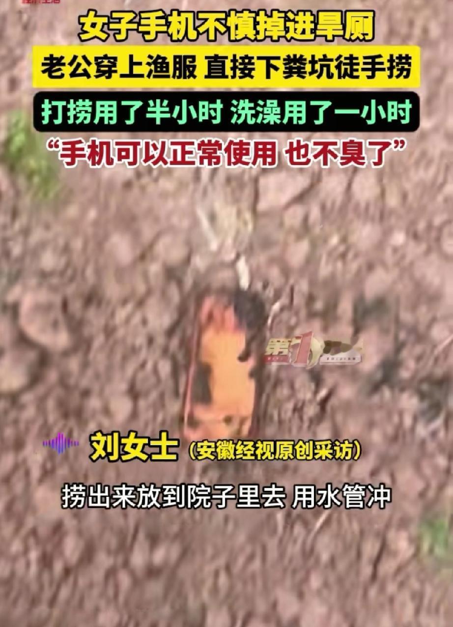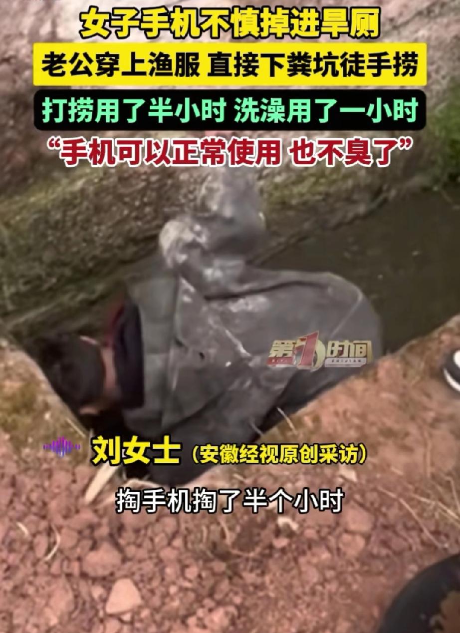 太有味了!大年初二,四川一位女子回娘家拜年,上厕所时手机不小心掉进了粪坑。丈夫得知后,借来捕鱼服跳进粪池徒手摸索了半个小时,终于把手机捞了出来。网友直呼:这才是“粪不顾身”的真爱! 年味正浓,刘女士和丈夫一早收拾好东西,开车回资阳老家给娘家拜年。乡路又窄,路上的车子还多,等夫妻俩赶到娘家,刘女士急着去稻场旁边的旱厕,随手就把新年新手机塞在了裤子侧边的口袋里。 等她上完厕所提裤子时,一扭头发现手机大半都露在口袋外面,想赶紧把手机塞回去,可已经来不及了,手机“咕咚”一声就滑进了粪池,瞬间就没了影子。 这手机可不是普通的手机,是丈夫年前攒了好久工资,特意给她买的新年礼物,才用了不到一个月,刘女士又心疼又着急,赶紧找了根竹棍在池子里翻找,可粪池比想象中深,竹棍根本够不着手机。 丈夫发现妻子这边的异常后立马赶过来,得知新手机掉粪池里了,也跟着着急,一家人赶紧找来粪勺、锄头、耙子……各种农具全上阵,在粪坑里捣鼓了半天,结果手机就像石沉大海,连个影儿都没见着。 就在全家人都快放弃的时候,她老公站出来了。人家不是叹气,也不是埋怨“让你不小心”,而是直接跑去找舅舅借了条渔裤,换上之后,“扑通”一声跳进了粪坑! 他弯着腰在浑浊的池子里一点点摸索,一点都不嫌脏不嫌累,心里只想着把手机捞上来,就这么认真找了整整半个小时,终于把手机捞了上来。 你知道这半个小时意味着啥吗?那是零下几度的天,一个满是污秽的旱厕坑。他老婆在旁边看着,可能眼泪都要急出来了。但这大哥心里就一个念头:这是送媳妇的礼物,得捞!不能让她难受! 捞完上来,他自己洗了整整一个小时的澡。可捞出来的手机呢?擦干净了,能正常用,一点儿不臭了。 这哪是捞手机啊?这是在告诉老婆:你心疼的东西,我比你更心疼;你的着急、你的懊恼,我都愿意跳下去帮你捞上来! 有网友说:“这才是真爱!这手机要是丢了,得心疼一辈子;但这老公的表现,够她暖一辈子。” 有网友开玩笑说:“这手机得供起来,因为它见证了一场‘粪’不顾身的爱情。” 日子过得好不好,看这儿就知道了 咱们普通人过日子,真不需要天天山珍海味、鲜花钻戒。就看你遇到事儿的时候,身边那个人是什么反应。 是皱着眉头嫌弃你“怎么这么不小心”?还是二话不说,穿上渔裤就往下跳? 这大哥用行动证明了一件事:重要的真不是那个手机,重要的是——你。 你的开心,你的小失误,你的心疼,他都愿意接着,哪怕那地方又脏又冷。 给这位实在的四川好男人点赞!也愿咱们所有人,在生活里都能遇到那个,愿意为你“奋不顾身”的人。