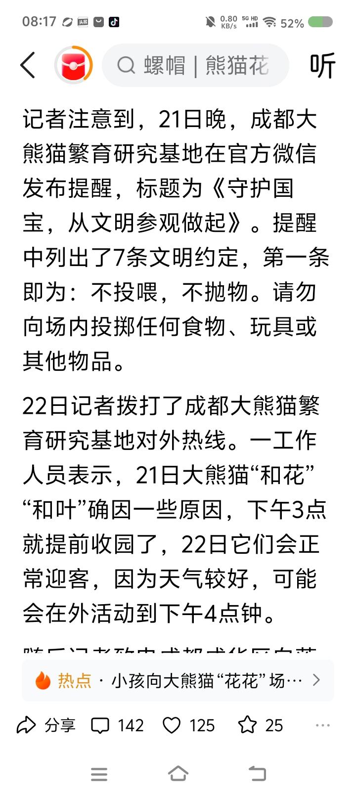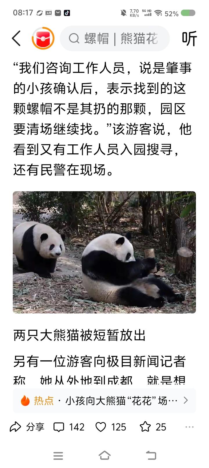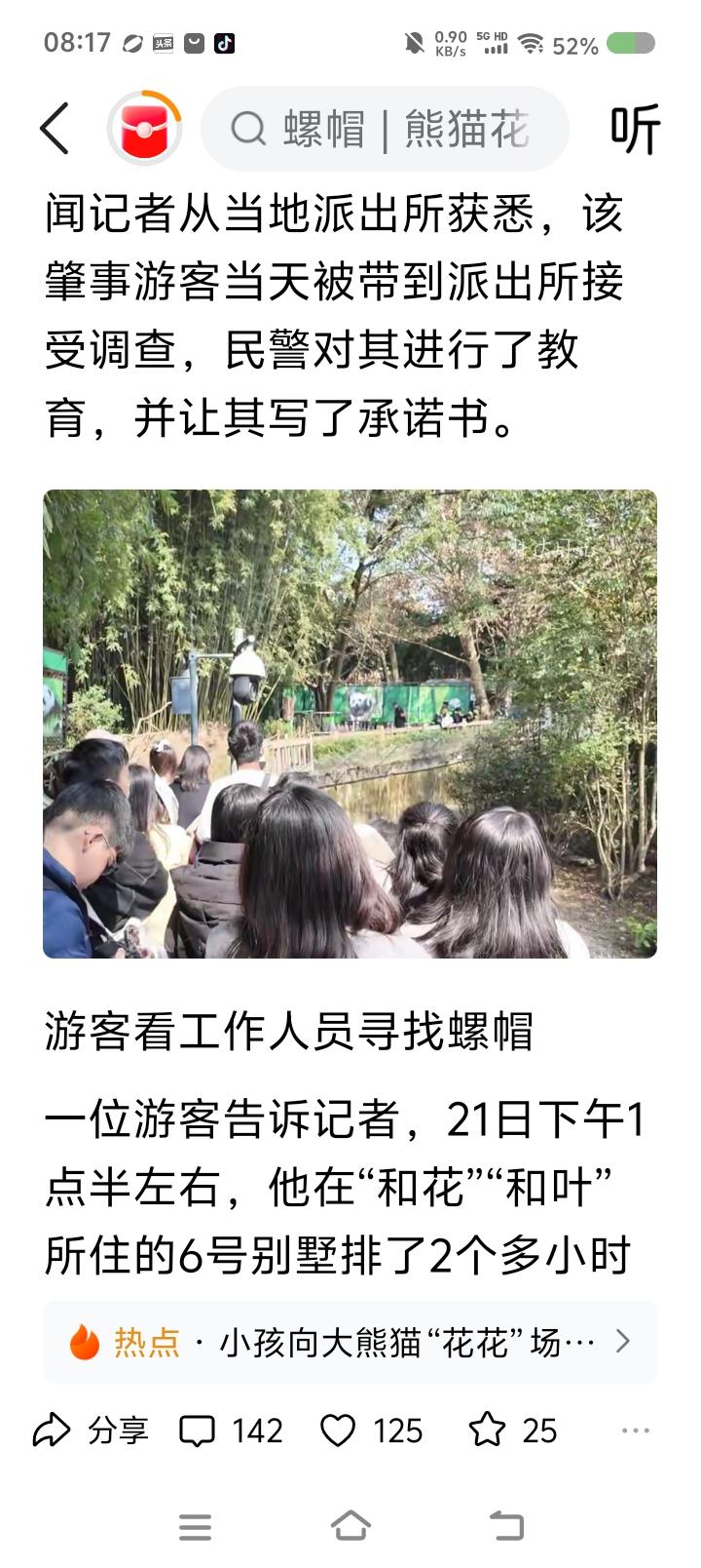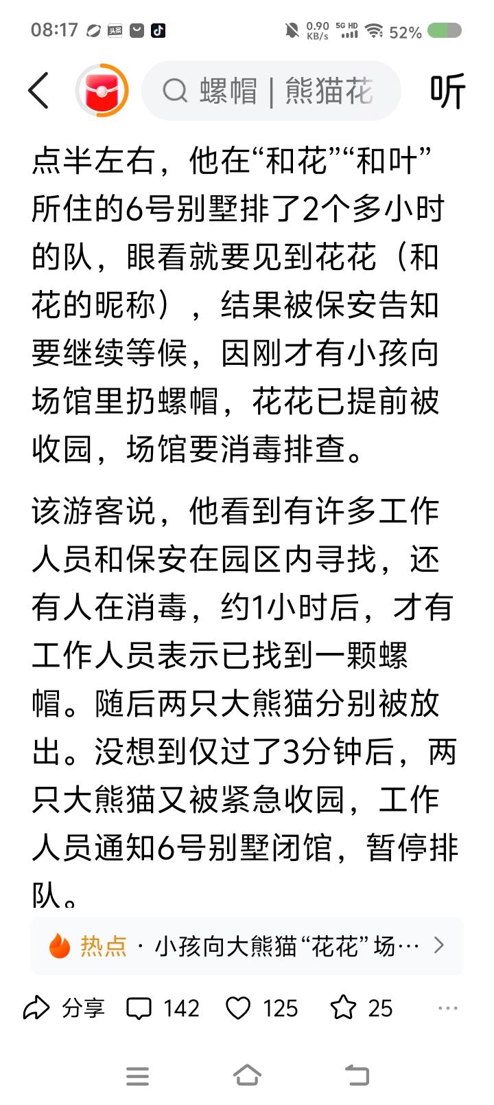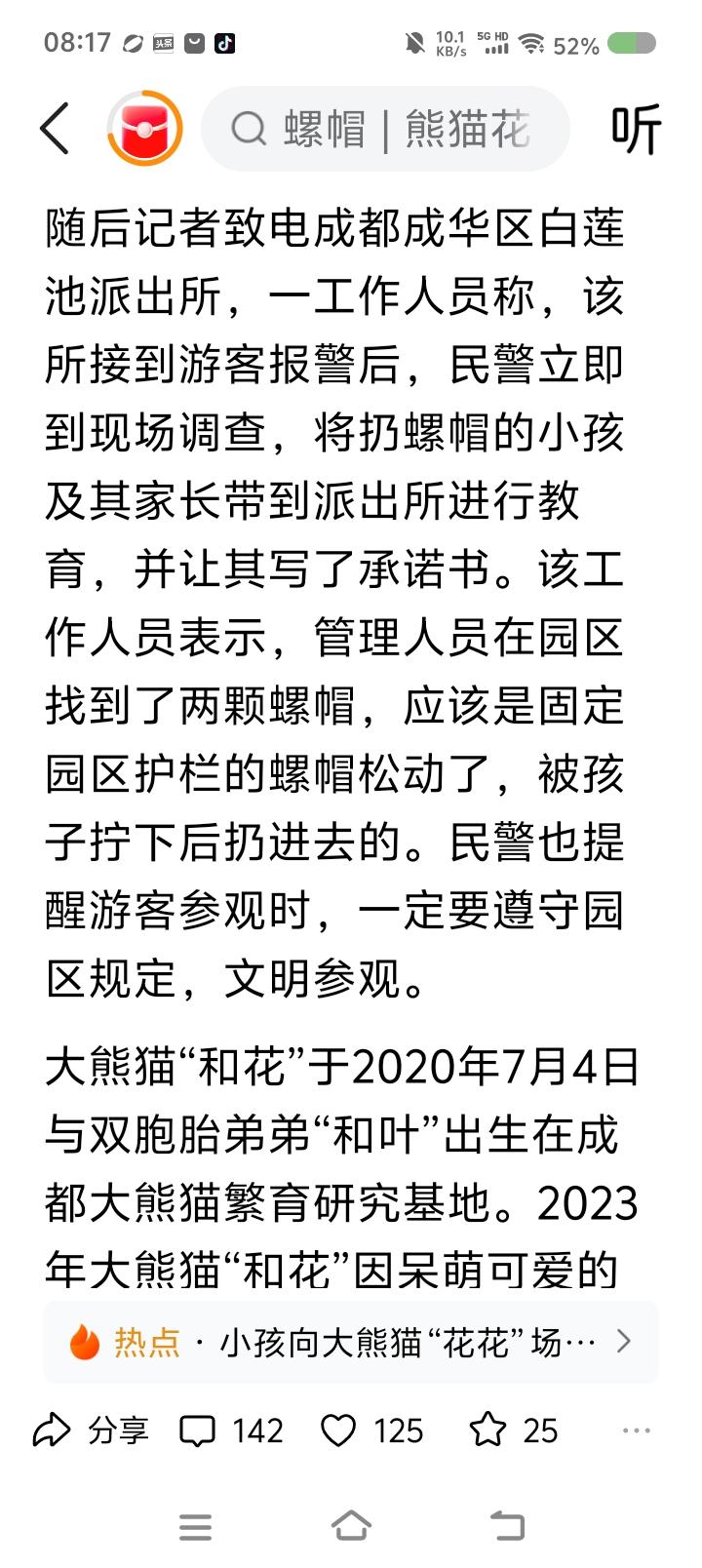 有人往熊猫馆扔螺帽?—— 据报道,近日,有游客参观大熊猫时,往园区内扔螺帽,导致场馆几次临时关闭。警方已处理。工作人员判断,螺帽来自护栏,被该游客拧下来了。但肇事游客表示,某一颗不是自己扔的。 点评: 一、一则新闻,把基本事实没搞清:该游客扔了几颗?必须查清。 二、“不投喂,不抛物。”这么难吗?有那个时间和钱逛景区,没时间看游园规定?公民的基本素质在哪? 三、因为个别人的违规,导致大量游客受影响,这些后果违规者想过么?报道说,是个孩子。必须连带处罚监护人!