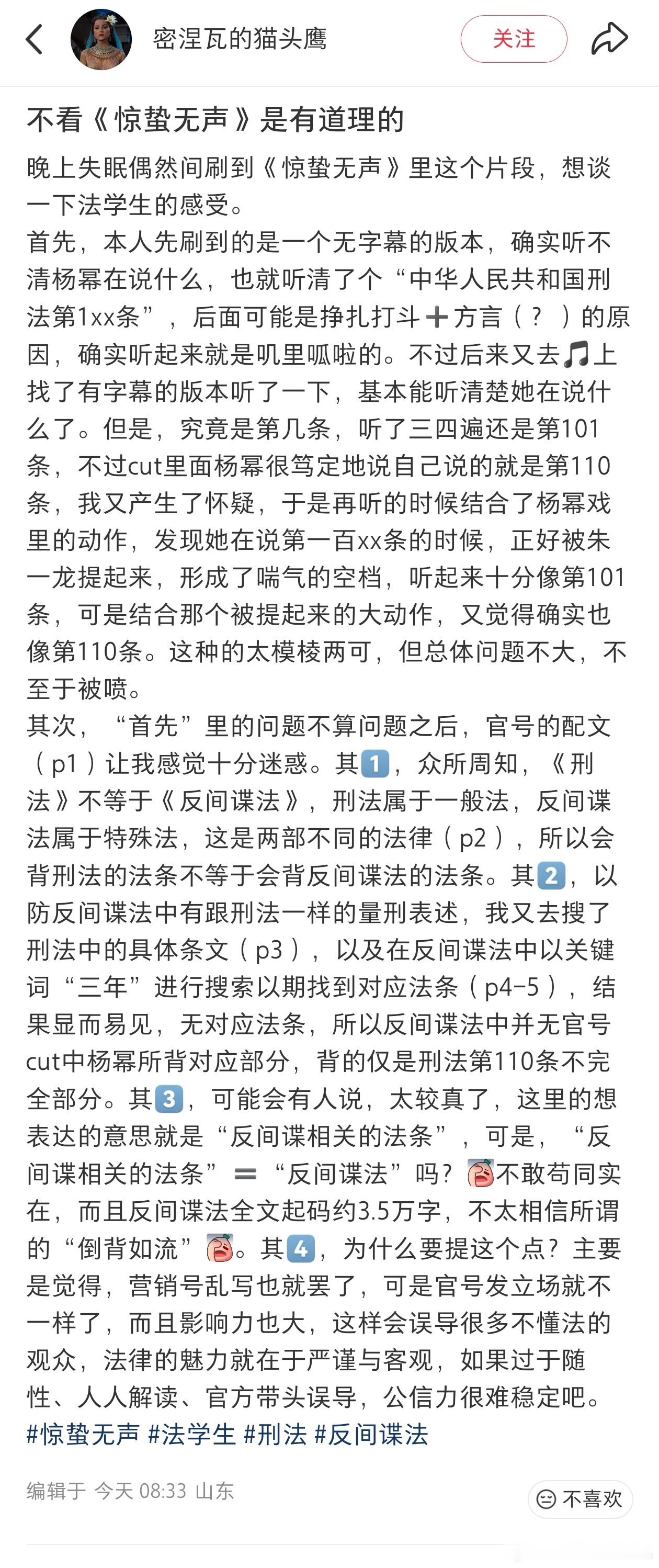 真嘟假嘟?去搜了一下,惊蛰无声确实营销过老蜜这点,有个法学生较真还认真分析了老蜜说的到底是110还是101,不过不管是110还是101,都是不严谨的,反间谍法有专门的法律。