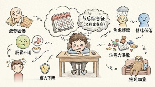 上海中医药大学附属岳阳中西医结合医院老年病科姜恺副主任医师解释,节后综合征也被称为富贵症,通常出现在一个较长的假期之后,常见的症状为疲劳困倦、肠胃不适、头晕头痛、免疫力下降、焦虑烦躁、情绪低落、注意力涣散、拖延加重等。节后综合征属于身心适应过程中的暂时性亚健康状态,并非传统意义上的疾病,但对出现该综合征人群的生活质量、工作效率产生了一定的负面影响。