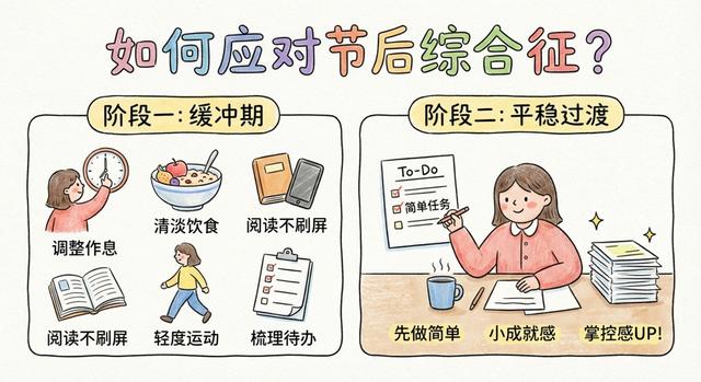 医生建议,可以从两个阶段入手:阶段一,将最后1-2天假期作为缓冲期,调整作息,按照日常工作学习节奏重新“校准”生物钟。配合清淡饮食,避免节日期间的“胡吃海塞”,让消化系统和人一样得到休息。用阅读替换刷短视频,用散步、慢跑等轻度运动代替狂欢,简单回忆并梳理节后待办事项,让身心提前进入状态。阶段二,刚工作时平稳过渡,将之前梳理好的待办事项逐一完成,可优先选择完成那些相对简单的任务,通过连续的小小成就感缓解复工后的不适应,逐步增加对工作和学习的掌控感。