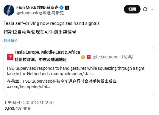 马斯克转发的是2月22日特斯拉官方发布的最新测试视频,该视频展示其特斯拉FSDSupervised系统在欧洲道路环境下的技术进展。视频内容显示,测试车辆在荷兰境内狭窄车道行驶过程中,系统能够实时捕捉并解析前方人员的手势指令,据此执行前进或停车等操作,展现出接近人类驾驶员的判断能力。