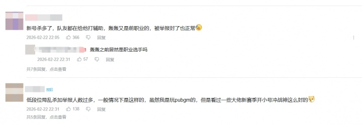 有玩家分析认为,封禁极有可能是因为“炸鱼”触发了举报机制:“新号杀多了,队友都在给他打辅助,轰轰又是前职业的,被举报封了也正常”
