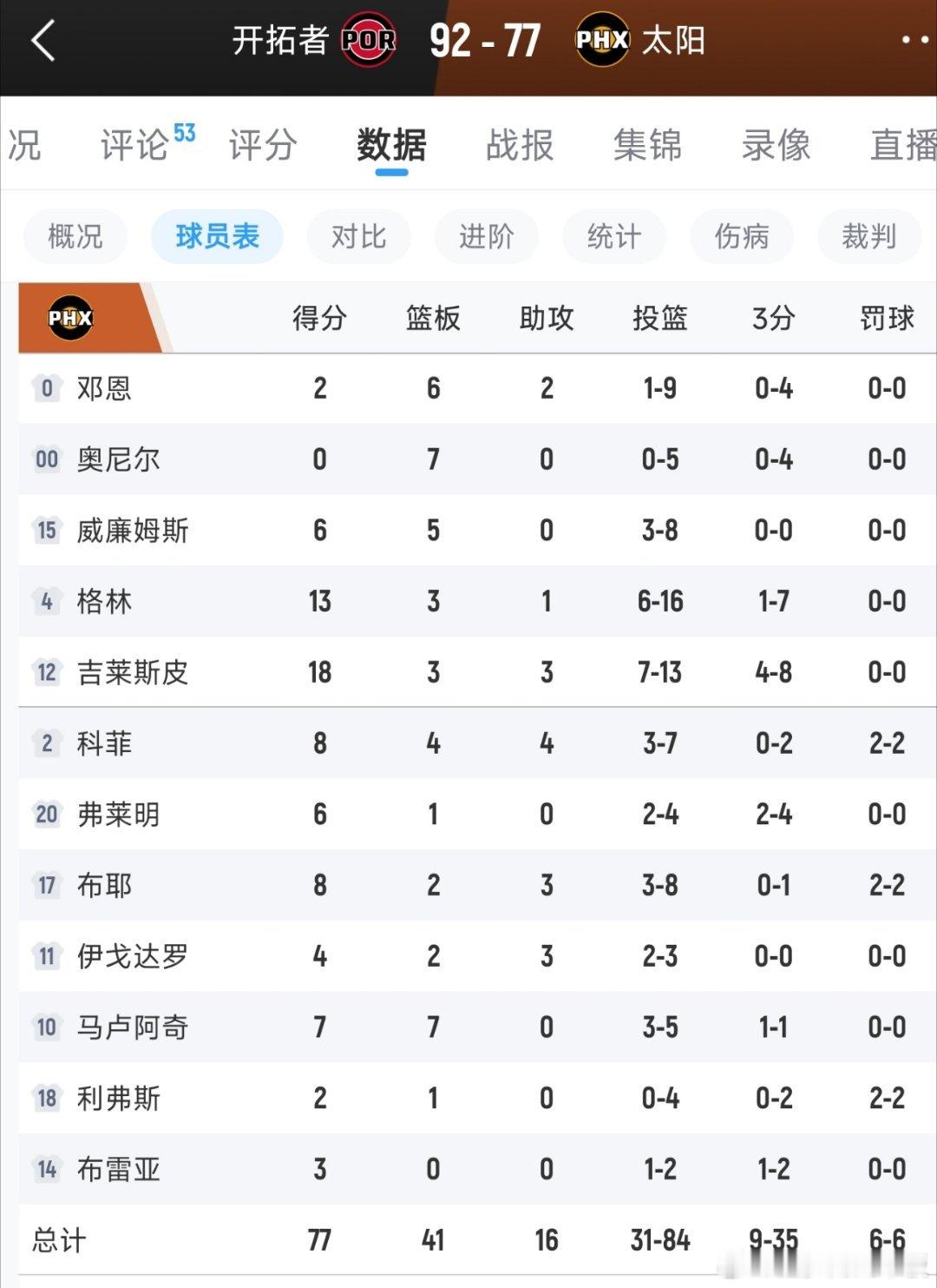 太阳全队命中率36.9%,仅杰伦-格林和吉莱斯皮得分上双🥶开拓者vs太阳