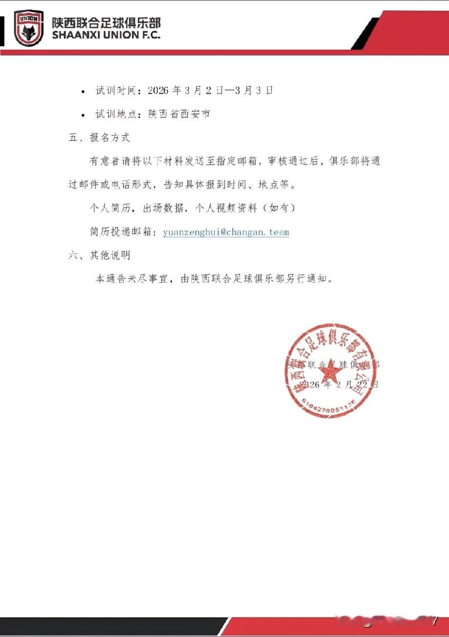 这春节假期也马上结束了,陕西联合成年队也没有闲着刚刚过完年已经出现在重庆,将和刚刚升入中超的重庆铜梁龙进行几场友谊赛,旨在磨合球队。 同时陕西联合俱乐部也在为组建自己的U20年轻队,加强梯队建设也向全国发出发出试训通告。陕西联合一切都在按部就班的走向正轨,期待西北狼陕西联合俱乐部一步一个脚印,走出属于自己的一片蔚蓝天空。