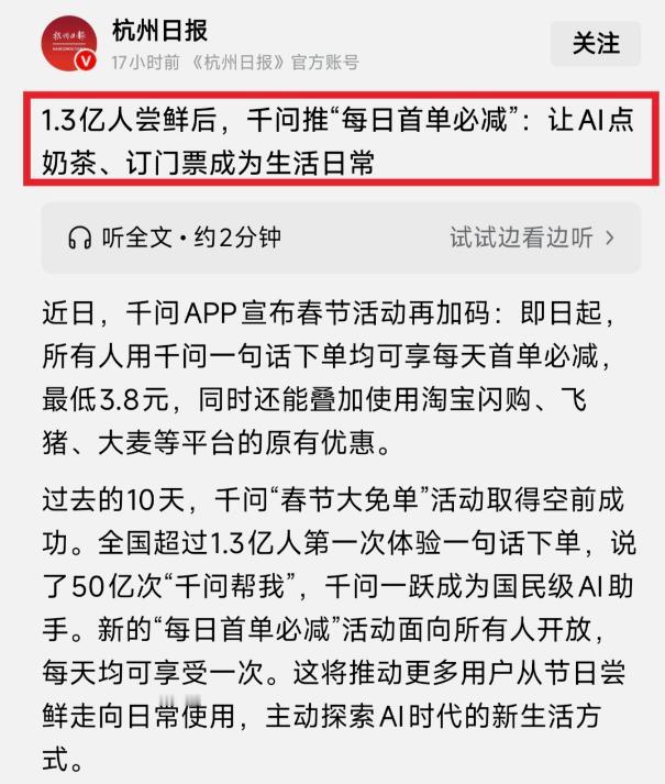 发现了吗?国内社会正在出现一个变化,很多人已经置身其中。 今年春节,有个事儿挺有意思。很多人第一次用AI来买东西了。 就是那个叫“千问”的AI助手。它搞了个大免单活动,让大伙儿试试用AI搞定日常需求。 结果你猜怎么着?活动期间,全国有1.3亿人,是第一次体验用AI购物。大家说了足足50亿次“千问帮我”。 这数字,听着都吓人。说明啥?说明AI真的开始走进普通人的生活了。 本来以为活动结束就没了。没想到,从2月17号开始,千问又出了新招。 叫“每日首单随机立减”。最少能减3块8。还能和淘宝、飞猪、大麦这些地方的优惠一起用。 想想看,每天早上起来,对着手机说一句“千问帮我点个早餐”。既能省钱,又省事。 这不光是买个东西那么简单。它意味着,我们的生活习惯正在悄悄改变。 以前买东西,得打开这个APP那个APP,比来比去。现在呢,直接跟AI说一声就行。 有网友就说,我还没用过千问呢。我用的叫豆包,但用得也少。买东西还是去实体店,或者用拼多多、抖音。 你看,这就是差距。有的人已经用上AI了,有的人还没跟上。 还有网友担心,AI这么厉害,能不能多提供点工作机会?能不能让贫富差距小一点? 这些问题,确实值得想想。科技发展快了,大家都得跟着适应。 但不管怎么说,千问这次是真的火了。它已经成了很多人手机里离不开的帮手。 今天它能帮你买票订餐,明天可能就能帮你安排行程、处理杂事。甚至提前帮你避开麻烦,做出最好的选择。 未来可能真不用开那么多APP了。有一个能听懂话、会办事的AI,就够了。 这变化,就在我们身边发生着。你感觉到了吗? 对此,你怎么看?