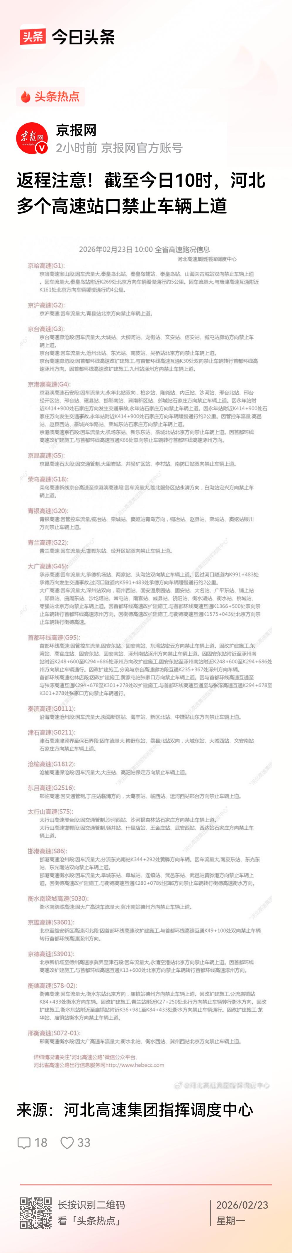 河北已经多个高速口封闭,不准上道了!这是必须要保证已经在高速路上的车辆通行,否则就全都堵死了。大家理解吧[作揖]
