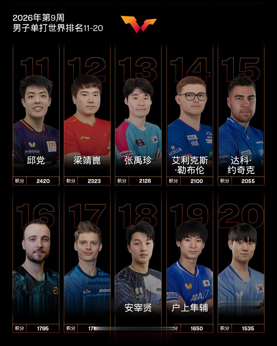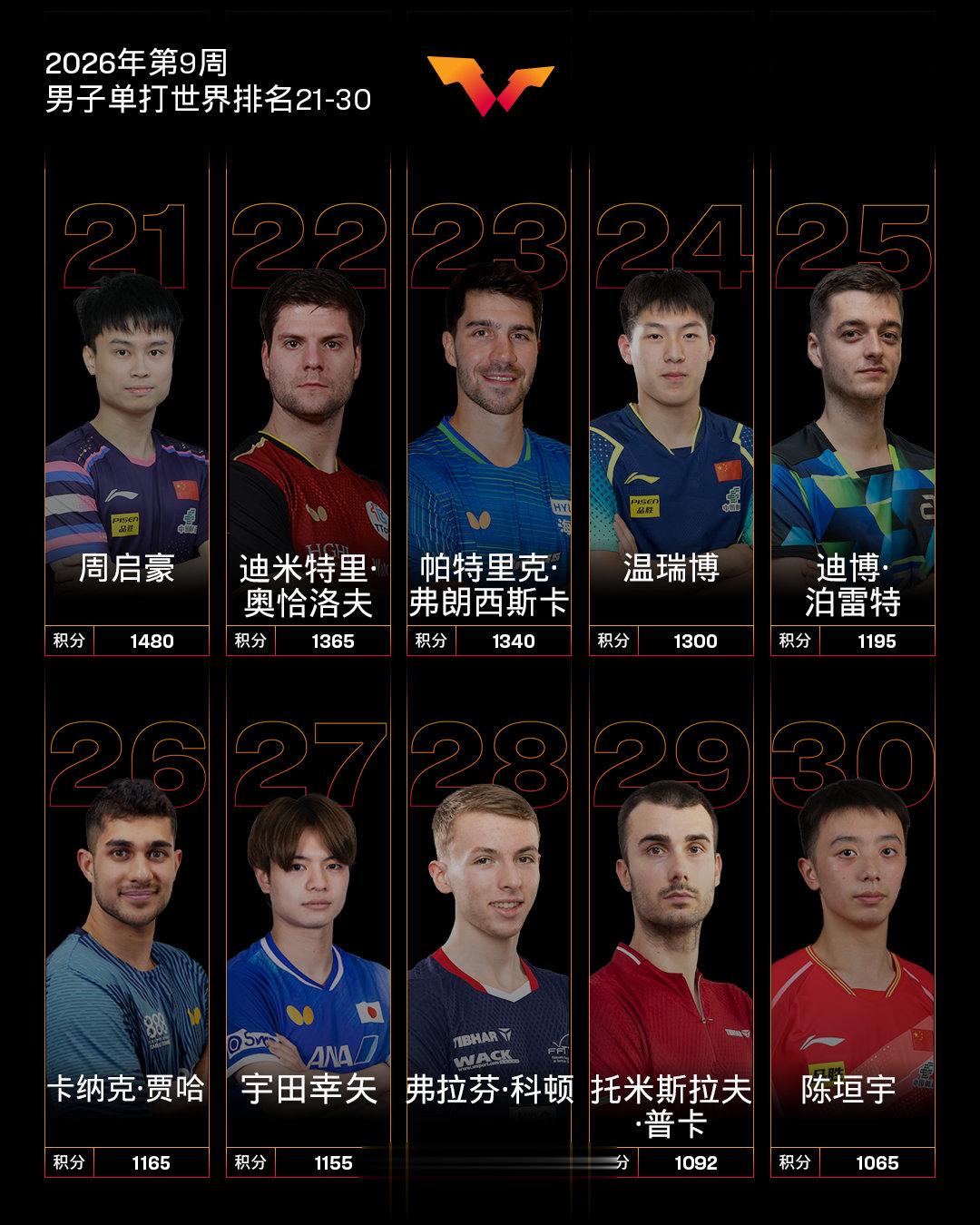 其他中国队球员,梁靖崑排名第12,周启豪排名第21,温瑞博排名第24,陈垣宇排名第30,陈俊菘排名第37。