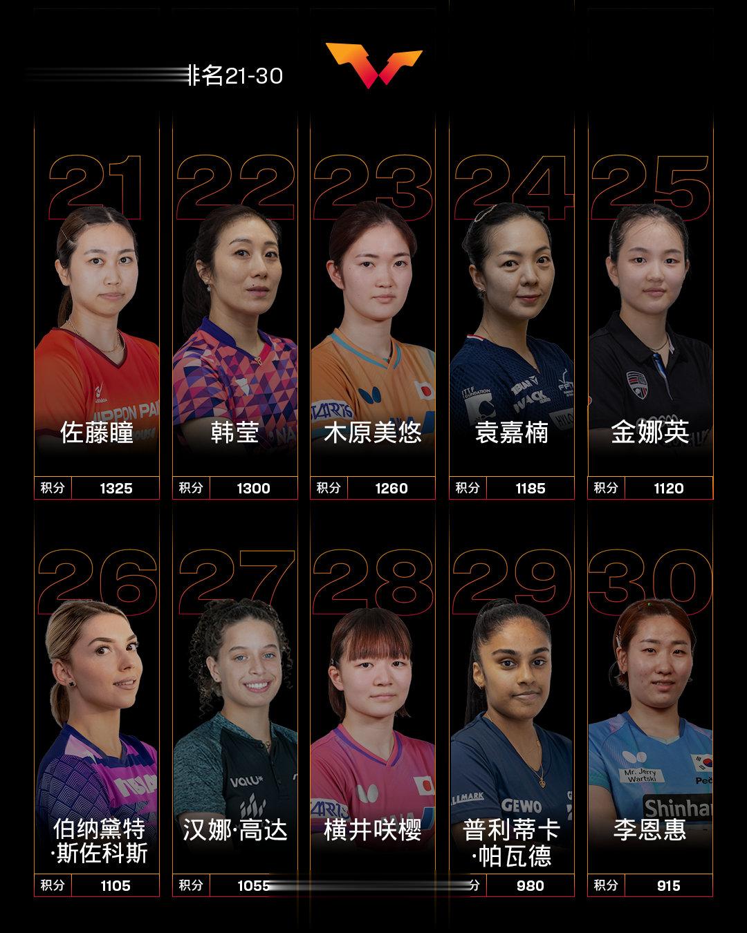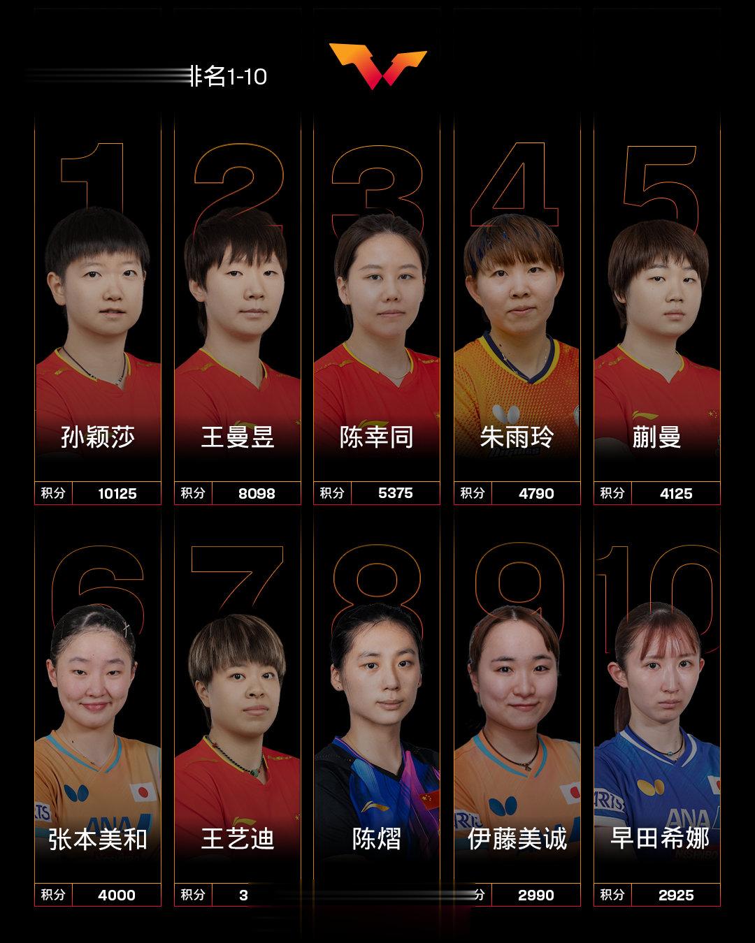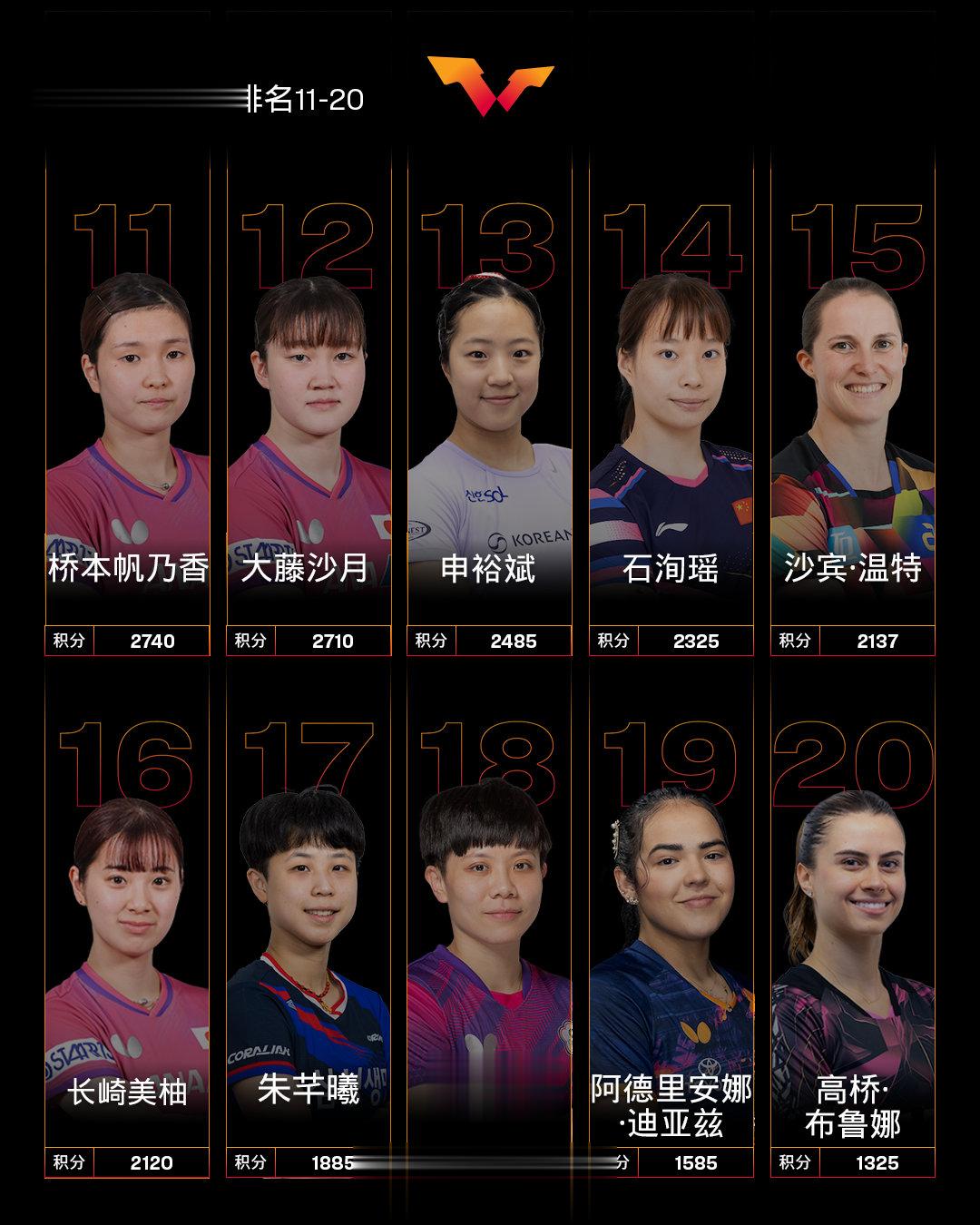 女子单打,中国队球员孙颖莎、王曼昱、陈幸同位列前三,蒯曼位列前五,王艺迪位列第七,陈熠位列第八。郑怡静排名上升1个名次位列第18;阿德里安娜-迪亚兹排名上升1个名次位列第19;高桥-布鲁娜排名上升1个名次位列第20。
