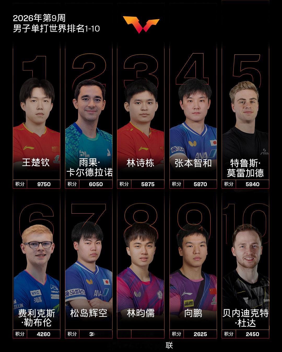 男子单打,中国队球员王楚钦位列第一,林诗栋位列前三,向鹏位列第九。贝内迪克特-杜达排名上升1个名次位列第10;邱党排名上升1个名次位列第11。