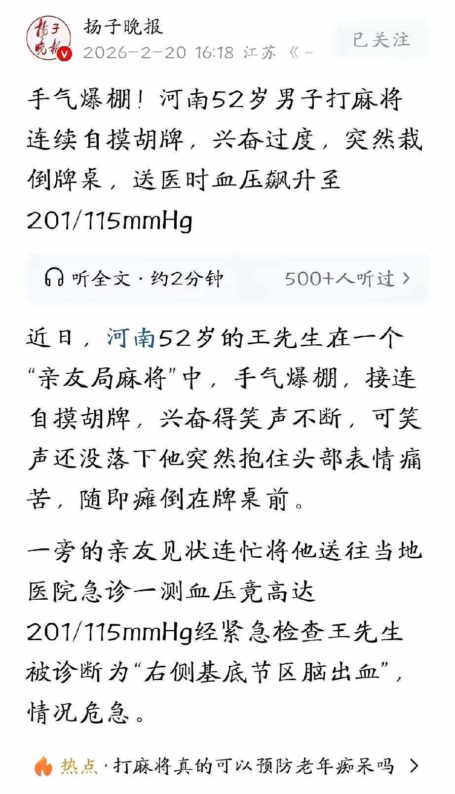 河南,一52岁男子春节和亲友们打麻将,手气太好连续自摸胡牌,可哪知道在一声声“胡了”的高兴声中,男子兴奋过度一头栽倒在地。幸亏及时送医抢救,检查发现男子竟是脑出血,差点乐极生悲。 那天下午,王先生手气特别旺,连着好几把自摸,他笑得合不拢嘴,脸上红光满面,嘴里不停念叨“今天运气来了挡不住”。 谁也没想到,就在他又一次推倒牌大喊“胡了”的时候,突然脸色一变,双手抱住头,表情痛苦地蜷缩起来,接着整个人从椅子上滑下去,瘫倒在地不省人事。一屋子人都吓坏了,赶紧打120叫救护车。 送到医院急诊室,一量血压高压竟然冲到了200以上。医生马上安排做CT,结果是右侧基底节区脑出血,出血量不小,情况挺危险的。幸亏送医及时,经过紧急手术,总算把命保住了。 王先生有高血压好几年了,他觉得没症状就不碍事,药吃吃停停,平时也不量血压。这次打麻将太兴奋,血压飙得极高,脑血管承受不住破裂出血了。 人在太高兴或者太生气的时候,交感神经会很兴奋,心跳加快,血管剧烈收缩,血压在几分钟内就能蹿升几十个点。对于本身血管条件就不好的人,这种突然的情绪变化很容易出问题。 大悲、大喜同样伤身,中医老话就讲“喜伤心”,过度喜悦会耗散心气,导致心神不宁。从现代医学看,极端情绪波动很大概率是心脑血管事件的诱因。 春节聚会打麻将本是图个开心,但中老年朋友别久坐,每隔一小时起来走动走动,尤其是有高血压、糖尿病这些基础病的,一定得留个心眼。输赢看淡点,别较真,按时吃药,定期测血压,这些老生常谈的话,关键时刻真能救命。 健康这东西,拥有的时候不觉得,失去的时候才知道多珍贵。过节团圆适度娱乐,平稳心情,这才是对自己、对家人真正的负责。 各位读者你们怎么看?欢迎在评论区讨论。