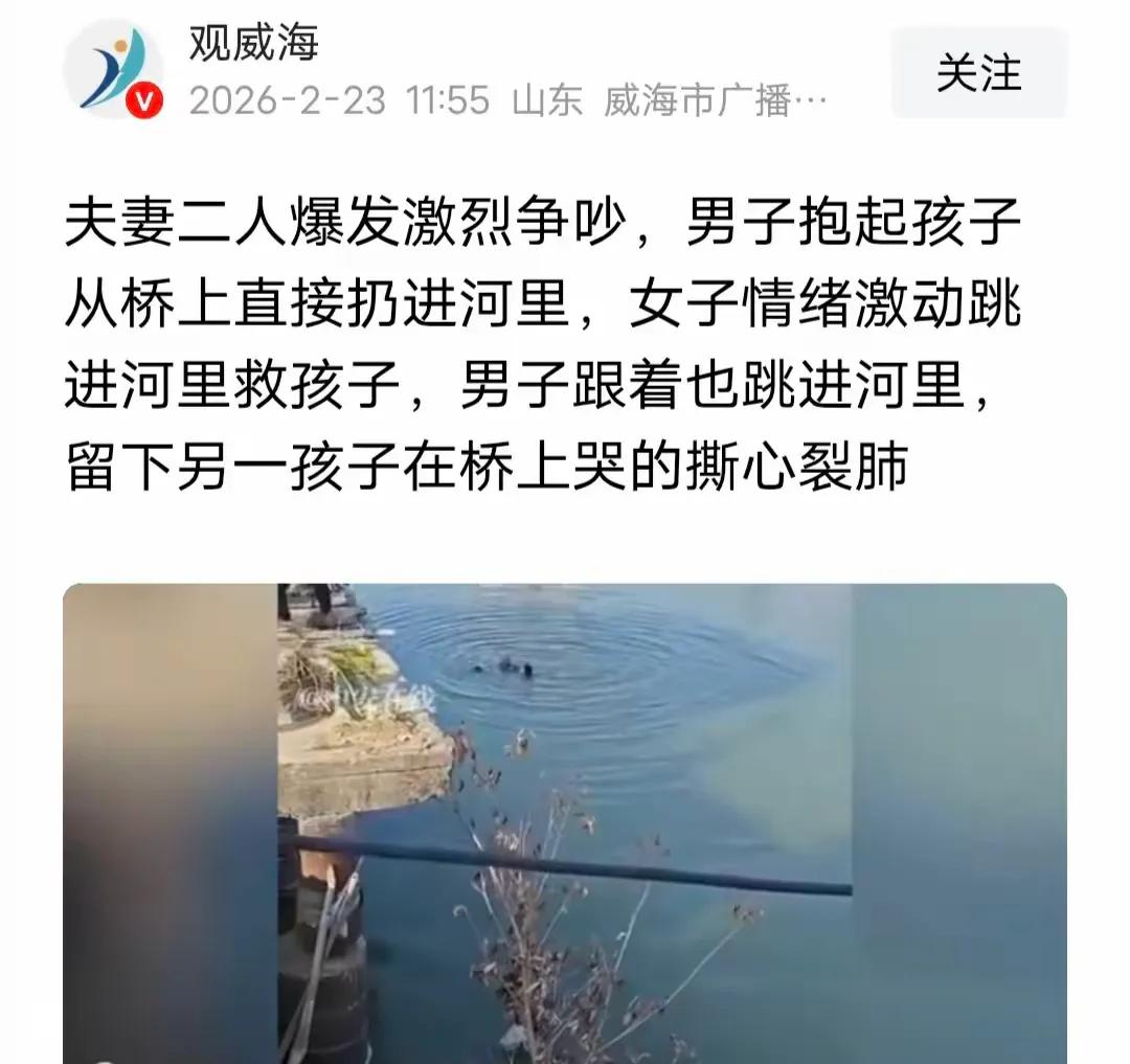太极端!广东潮州,两口子在河边激烈争吵,男子情绪失控一把抱起孩子从桥上扔进河里,女子见状崩溃嘶喊,直接跳进河里去救孩子。男子可能反应过来,也跟着跳了下去,另一个孩子在桥上破了声的哭喊:救救我妈妈。网友怒斥:这种男人赶紧离! 2月22日潮州的这一幕,隔着屏幕都让人浑身发冷。夫妻吵架本是家常事,可谁能想到,矛盾升级的最后,遭殃的竟然是毫无还手之力的孩子。从视频里能感受到那种窒息的慌乱,女子跳河的瞬间没有丝毫犹豫,眼里只有掉进水里的孩子,那份母亲的本能,看得人鼻头一酸。 最让人心疼的还是桥上那个哭喊的孩子。他或许还不懂大人的恩怨,只看到最亲的人一个个消失在河水里,恐惧和无助只能化作一句撕心裂肺的求救。路过的好心人及时出手,把河里的三人救了上来,这才没让悲剧演变成无法挽回的生死离别,想想都觉得后怕。 很多人说男子是事后后悔才跳下去的,可这根本不能成为洗白的理由。情绪失控从来不是伤害孩子的借口,那一刻他把孩子当成发泄怒火的工具,举起孩子的瞬间,就已经丢掉了为人父的底线。夫妻之间的矛盾,该解决的是两个人的问题,拿最弱小的孩子开刀,这不仅是道德的沦丧,更是触碰了法律的红线。 我们总说,为人父母是一场修行,可有些父母连最基本的情绪管理都做不到。婚姻里的争吵在所难免,但成熟的成年人,会懂得避开孩子,会守住“不伤害孩子”的底线。这个男子的行为,不仅给孩子留下了难以磨灭的心理阴影,也让这个家庭彻底陷入了信任危机。 网友喊着“赶紧离”,不是看热闹,是真的为母子三人的安全担忧。一个能在盛怒之下对亲生孩子下狠手的人,谁也不敢保证他下次情绪失控时,会做出什么更极端的事。婚姻的意义是彼此扶持、守护孩子成长,而不是让孩子成为大人坏情绪的牺牲品。 这件事也给所有为人父母的人敲了警钟,情绪上头时,先停下脚步想想孩子。孩子不是大人博弈的筹码,更不是发泄情绪的出口。守住对孩子的保护,守住做人的底线,才配得上“父母”这两个字。 各位读者你们怎么看?欢迎在评论区讨论。