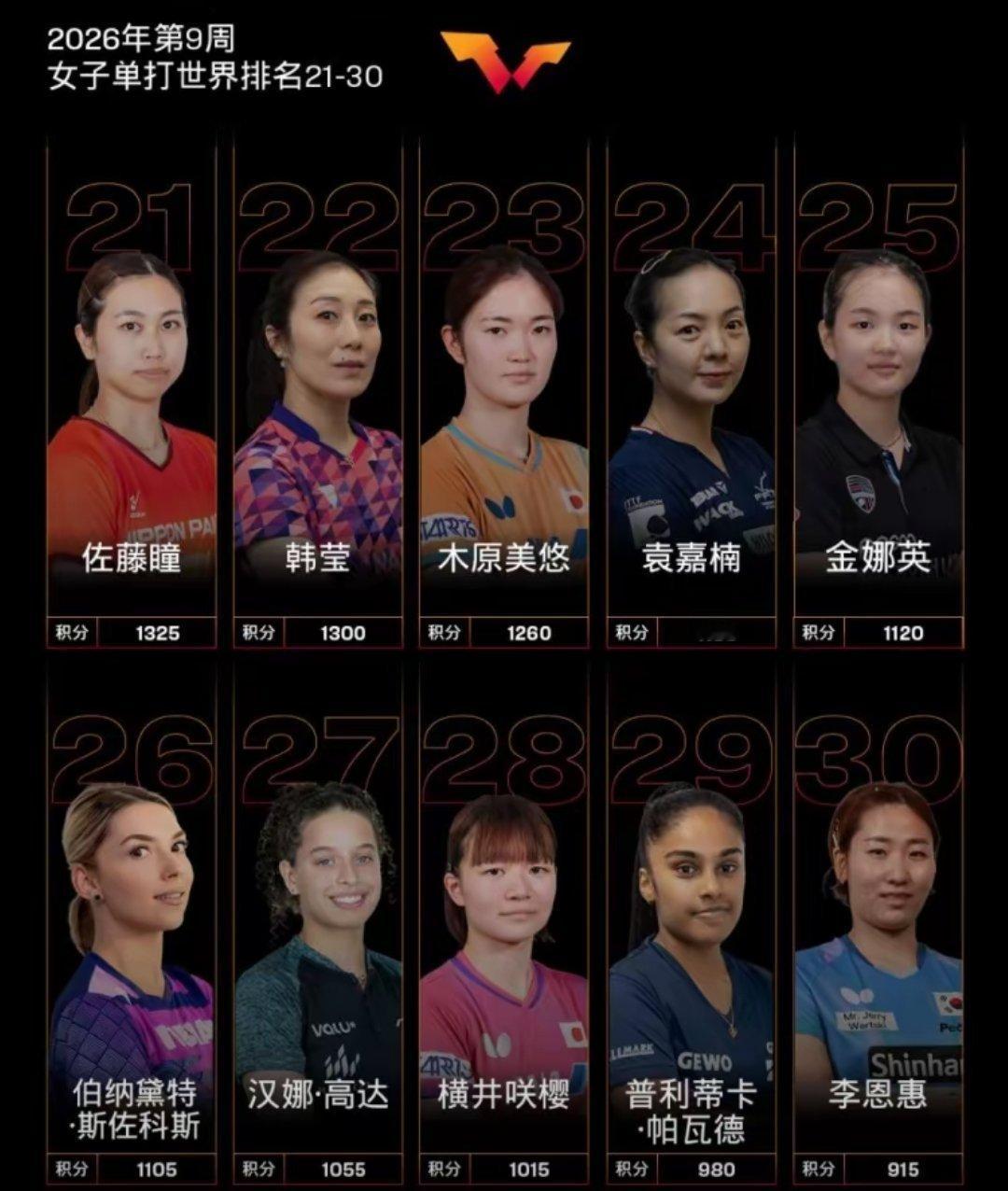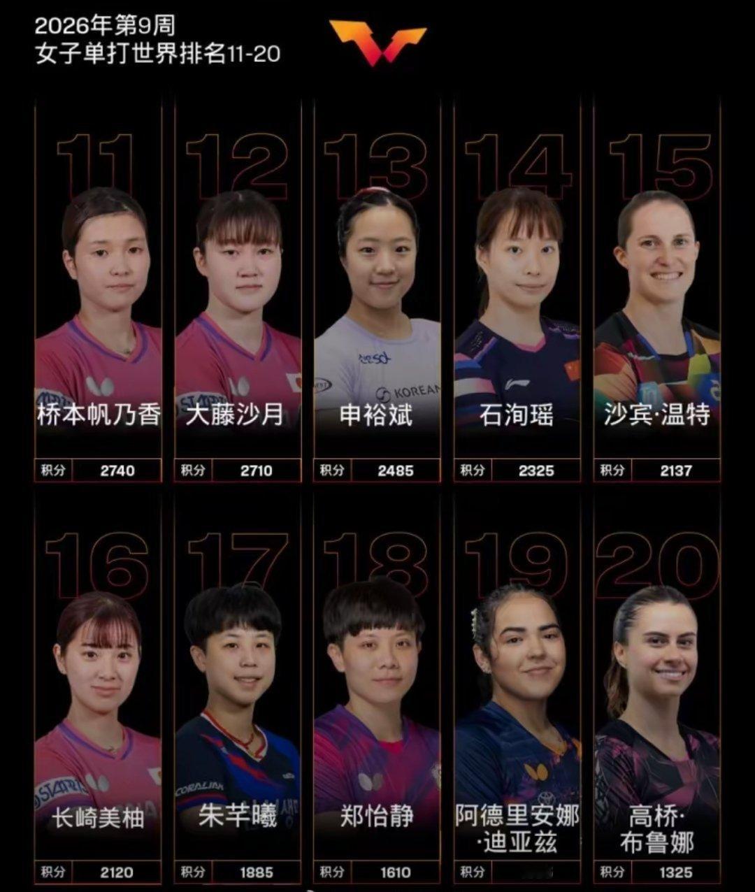 2月23日讯 今日,国际乒联公布了2026年第9周女单世界排名,前十球员里有6名国乒选手,其中孙颖莎、王曼昱、陈幸同位列前三,蒯曼第5位,王艺迪第7,陈熠第8。