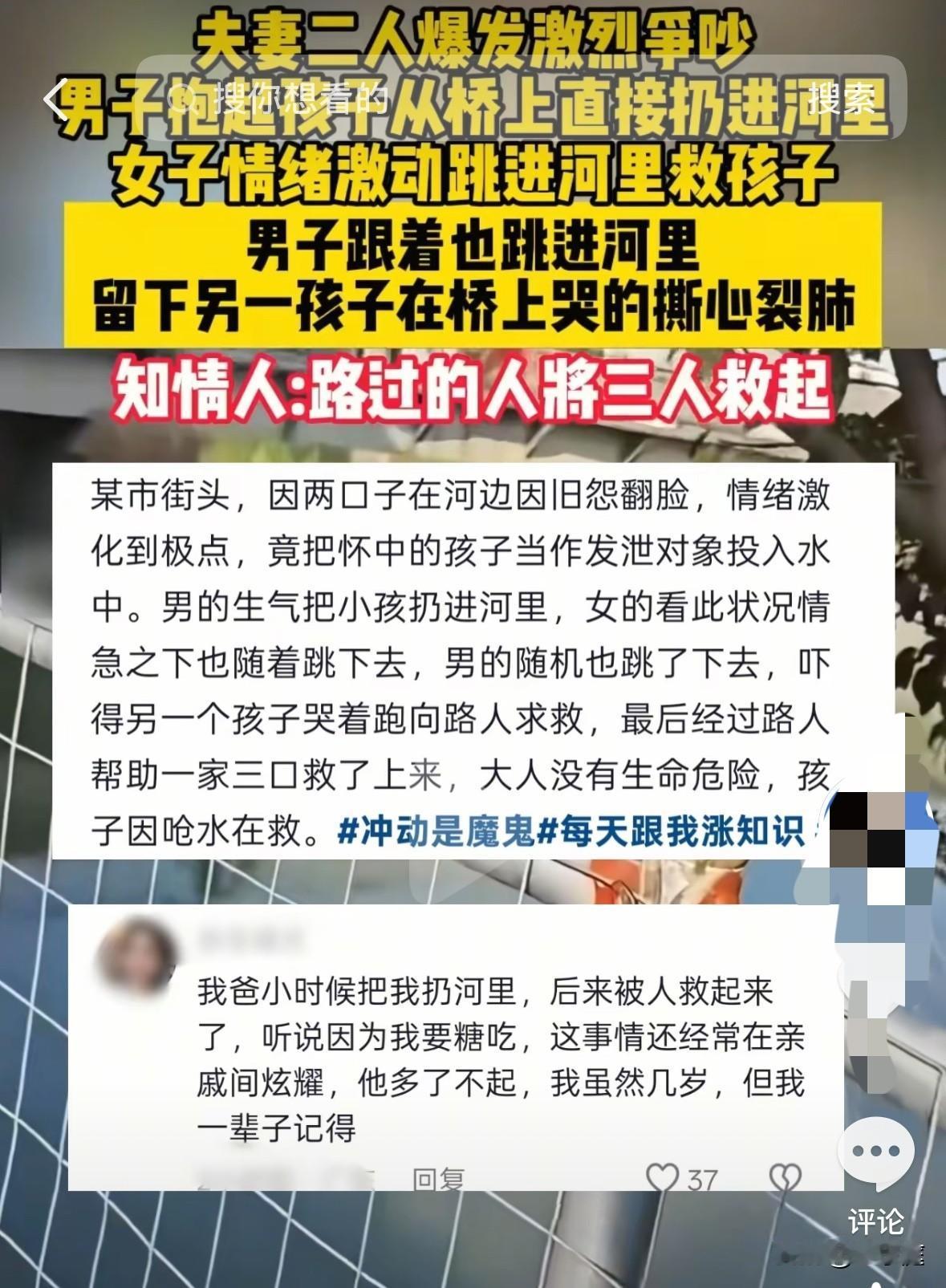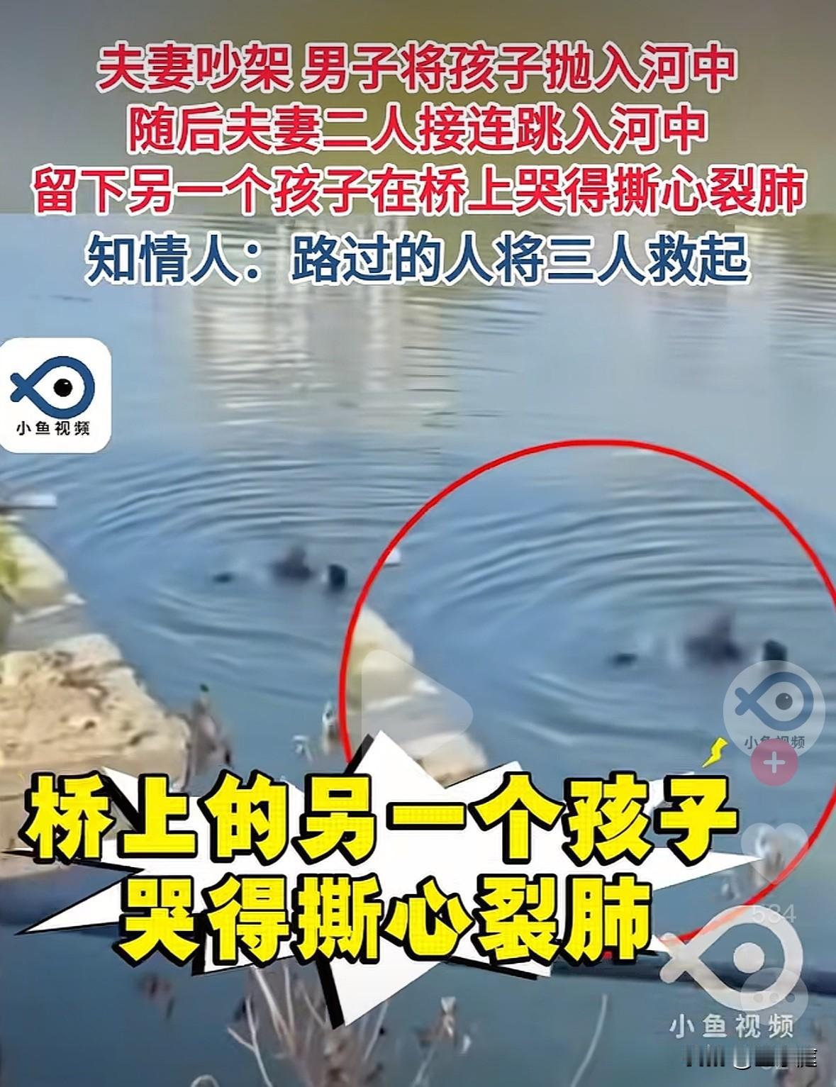 因夫妻吵架,将怀里的孩子从桥上抛进河里的男人现在恐怕是后悔不已了!婚姻能否保住暂且不论,孩子因呛水导致健康问题才是真的麻烦。 在这个事情里面,如果不是有热心的围观群众积极施救,真的不敢想象后果会是怎样? 根据媒体相关报道,大致是这么一回事: 广东潮州的一对夫妻,因一些琐事在一座桥上吵了起来。情绪激动之际,男子竟然直接抱起年幼的孩子从怀里丢进了河中。 孩子妈妈目睹丈夫的行为后,没有丝毫犹豫,果断跳入了水中去救孩子。紧接着,男子也跳了下去。这时候,桥上的另一个孩子吓得哇哇大哭,她连一句完整的话都还说不清楚,却仍不忘祈求围观的群众去救自己的妈妈。 最终,在热心人的及时帮助下,一家三口都被成功救了上来。 在这个事情里,最苦的就是那个年幼的孩子,大人吵架,他平白无故承担了所有。眼下,小小的他还因呛水问题在医院救治。等到他长大了,懂事了,要是回忆起这一幕,该有多么心塞啊! 这世上很少有不吵架的夫妻,关键要懂得去控制自己的情绪!一家人之间,有事说事,有矛盾要及时沟通,万万不该将怒气发泄在无辜的孩子身上。 这名男子都已经是两个孩子的父亲了,处事却如此极端,实在是太让人害怕了。 现在的他恐怕是后悔不已了!孩子呛水后被紧急送医救治,意味着他们的家庭要承担一笔不少的费用。他如此对待自己的亲生孩子,家庭关系也可能因此摇摇欲坠,甚至走到离婚的尽头。 人啊,不管时候都要懂得控制自己的情绪才好。如若孩子有个三长两短,这辈子他该如何与自己和解呢?[祈祷][祈祷]