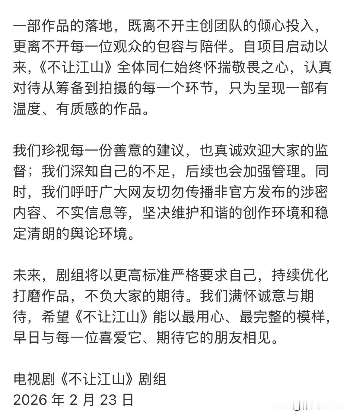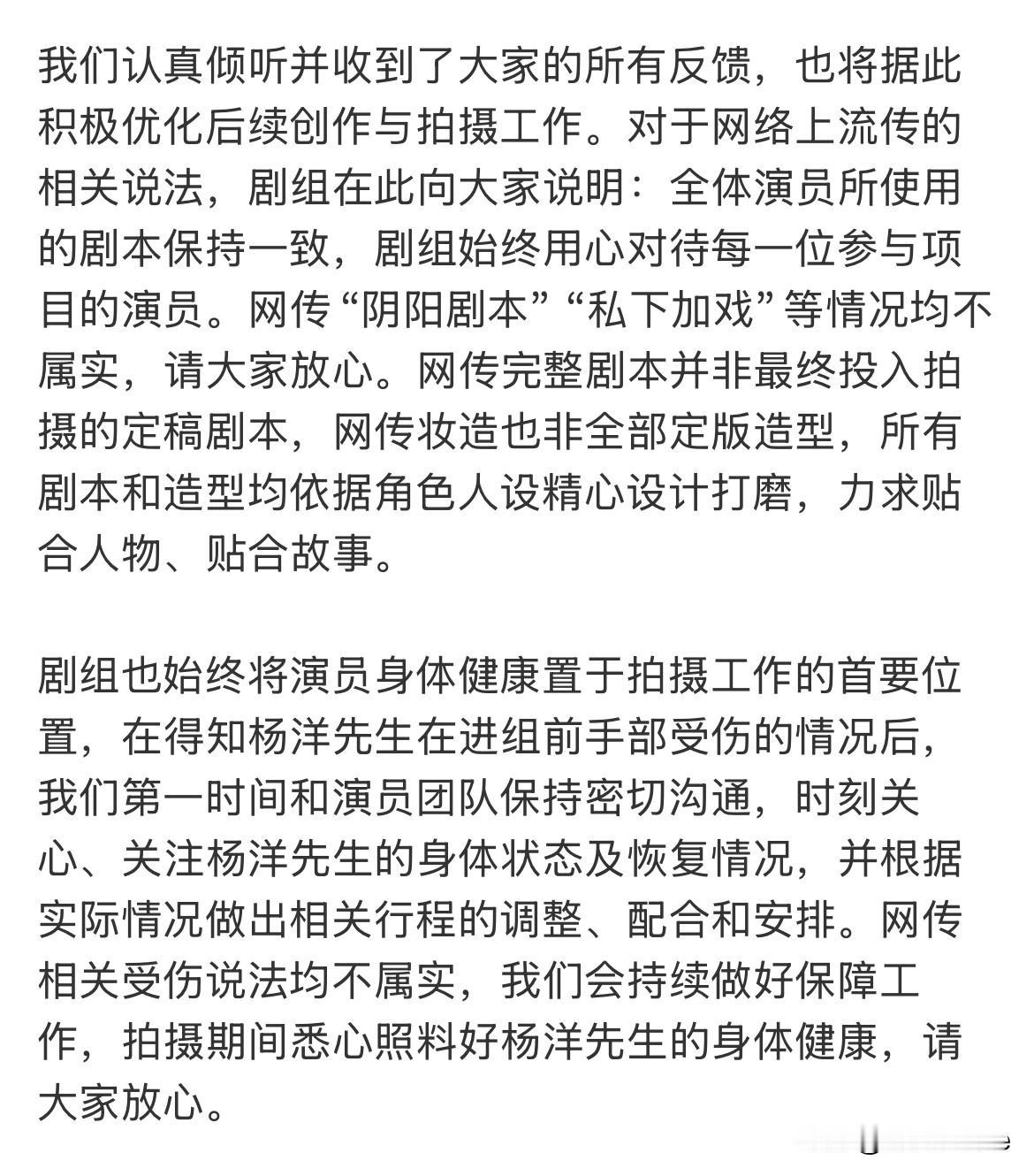 2月23日,杨洋带行李离开《不让江山》剧组后,《不让江山》剧组发出郑重声明! 否认阴阳剧本,否认配角私下加戏,否认杨洋受伤不实说法,对此杨洋家并不买账 这部剧开机没2天,问题不止2个,《不让江山》作为大男主剧,杨洋作为男一在开机仪式上站第二排,男配站第一排,这本身就不太合理,还有女配问题以及杨洋手部受伤问题等,杨洋这时候离开合理也不合理,毕竟项目开了后每天花费都不小,看声明,杨洋还是这部剧男主角,那么杨洋应该还是会带着行李回剧组,目前可能处于沟通状态~