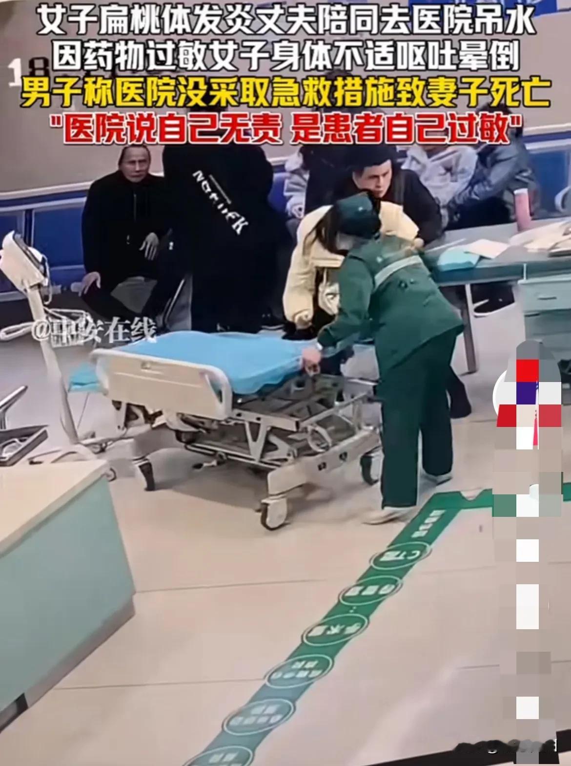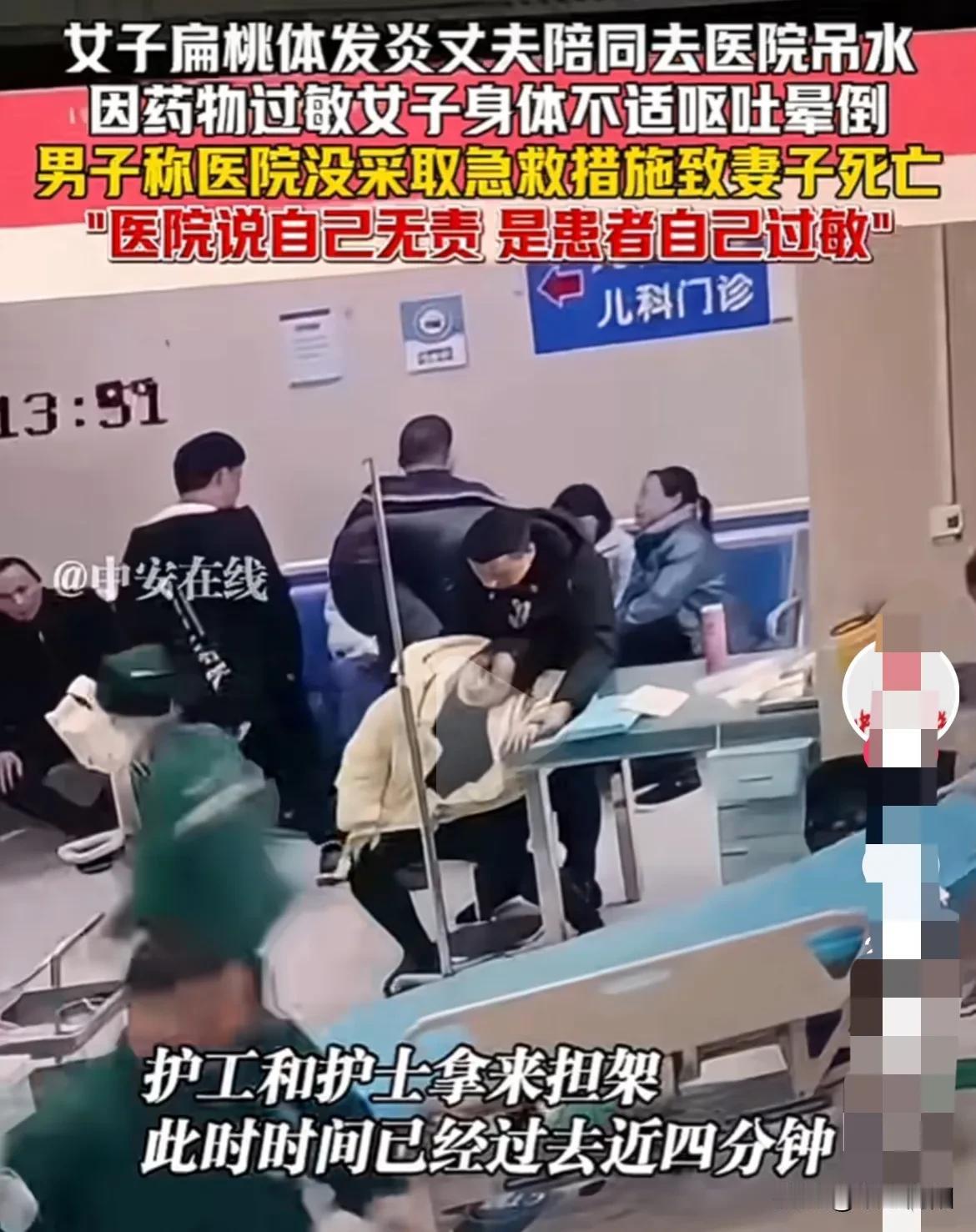 大过年的,女子因扁桃体发炎输液过敏去逝,医院竞然推卸责任,说女子自身过敏造成的。最让人气愤的是己经过去4分钟了,抢救人员不紧不慢才把单架车推过来,这时女子己晕厥过去了,黄金4分钟就这么浪费掉了,女子最终不幸身亡。难道这么大个医院连抢救处施也没有?真让人心痛! 医院拒绝担责,只是出于人道主义赔偿11万元,拒绝家属看病人遗体!