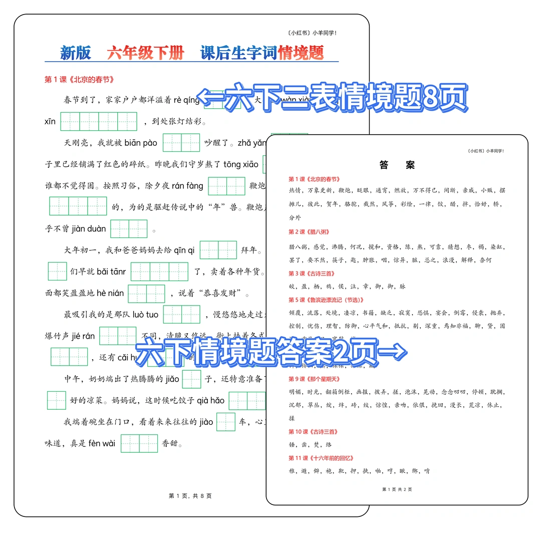 📄考试再也不是简简单单的看拼音写词语啦,都是情景题,这份就是结合课后识字表+写字表+词语表整理的一份“情境”挖空练习题。“大语文”考试方向的必kao题型。