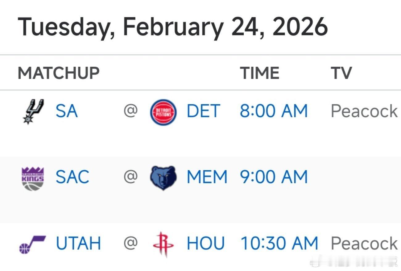 8:00 马刺vs活塞10:30 爵士vs火箭