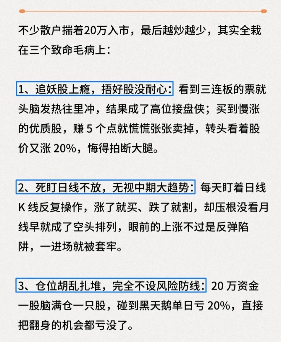 一、散户常见三大亏损原因 1. 追妖股上瘾,捂好股没耐心:冲动追高连板股成接盘