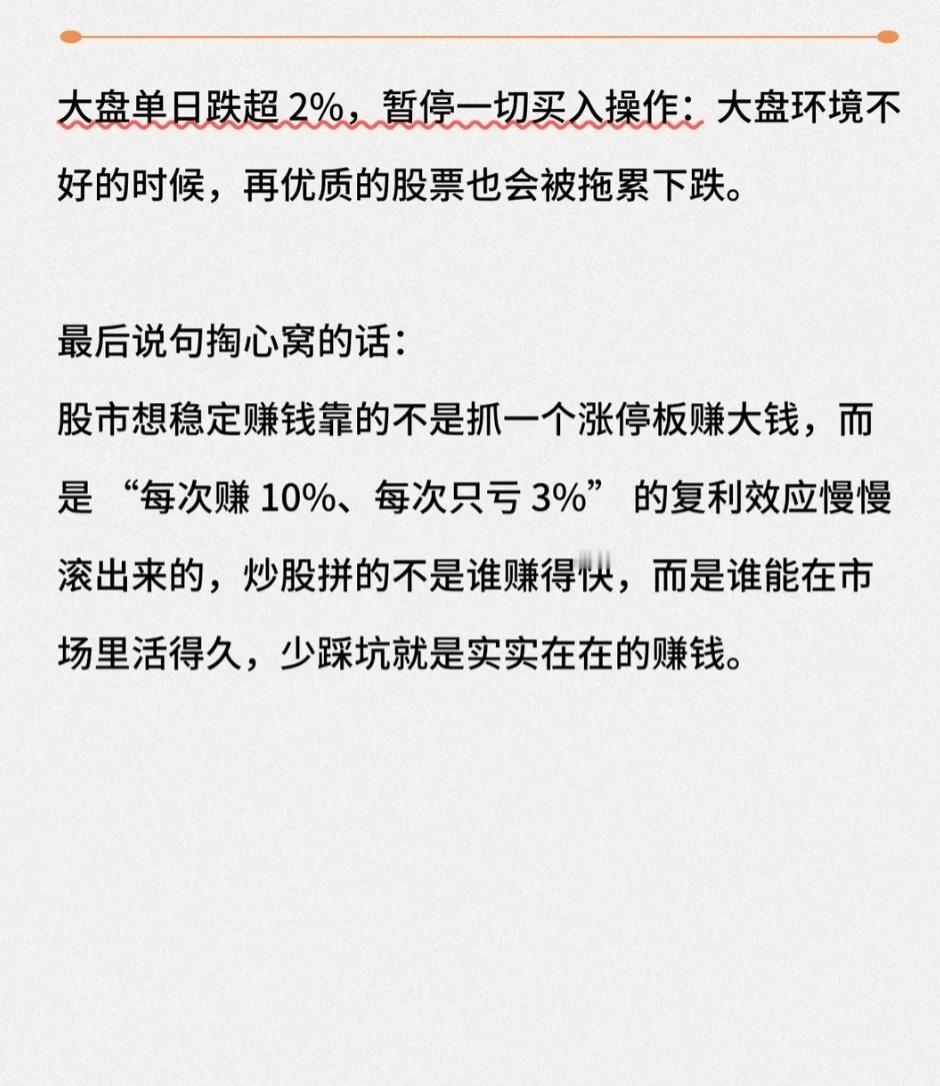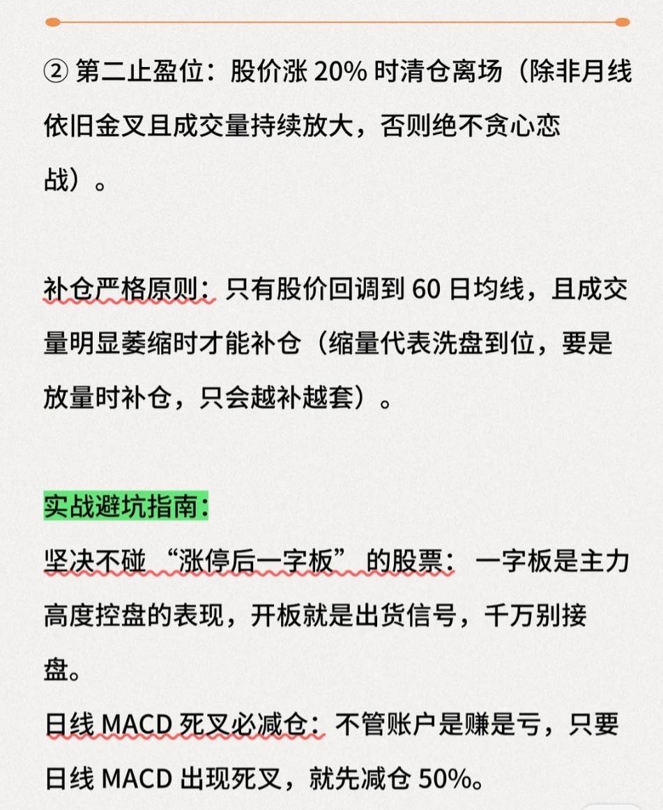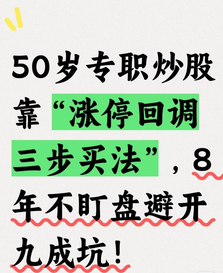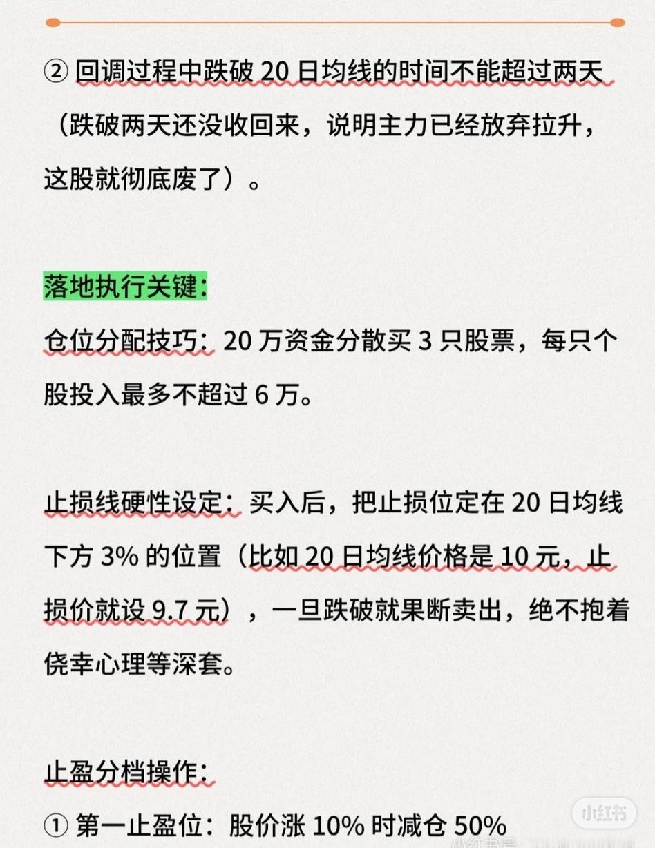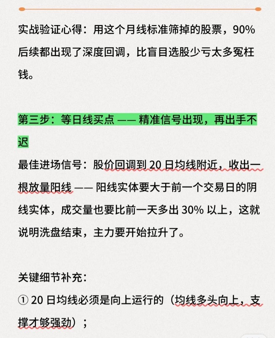 一、散户常见三大亏损原因 1. 追妖股上瘾,捂好股没耐心:冲动追高连板股成接盘侠,提前卖出慢涨优质股错失收益。 2. 只看日线,忽视中期趋势:频繁按日线买卖,忽略月线空头排列,易入套。 3. 满仓单只股,无风控:20万全进一只,遇黑天鹅单日亏20%,失去翻本机会。 二、涨停回调三步买法 - 核心逻辑:涨停=主力关注,回调到关键均线=洗盘,低吸安全。 - 第一步:筛选标的 - 近10天内有一次涨停,不碰三连板及以上。 - 剔除业绩亏损/暴雷股、涨停换手率>20%的股。 - 第二步:月线定趋势 - 月线MACD金叉(中期上涨确立)。 - 当月量>上月量,股价不破60月均线。 - 第三步:等日线买点 - 股价回踩20日均线收放量阳线,阳线实体>前日阴线,量增≥30%。 - 20日均线须向上运行。 三、执行与风控 - 回调跌破20日均线≤2天,否则放弃。 - 仓位:20万分3只,每只≤6万。 - 止损:20日均线下方3%(如10元→9.7元)。 - 止盈:+10%减半仓,+20%清仓(月线金叉+量持续可例外)。 - 补仓:仅限回60日均线且量缩。 - 避坑:不碰涨停后一字板,日线MACD死叉必减仓50%。 四、大局观 - 大盘单日跌>2%暂停买入。 - 稳定盈利靠复利:每次赚10%、每次亏3%,活得久比赚快更重要。 这套策略本质是趋势为先 + 均线支撑 + 严格风控,用纪律压制情绪,减少踩坑概率。
