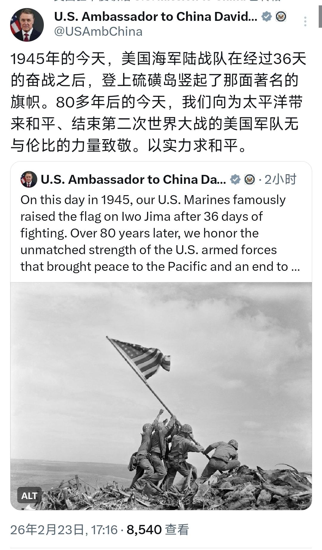 美国驻华大使庞德伟今天(2月23日)发文写道:“1945年的今天,美国海军陆战队在经过36天的奋战之后,登上硫磺岛竖起了那面著名的旗帜。80多年后的今天,我们向为太平洋带来和平、结束第二次世界大战的美国军队无与伦比的力量致敬。以实力求和平。” [机智]评几句:美国是和谁作战,现在是只字不提。如果曾经的屠龙者不希望自己变成恶龙,首先需要维护好战后秩序,不要让军国主义死灰复燃,然而,美国却一边纪念硫磺岛战役的牺牲,一边纵容昔日战败国突破和平宪法束缚、扩充军备,将其绑上霸权战车。这场美军伤亡超2.8万人的惨烈战役,本是反法西斯的血色注脚,如今却被偷换为“以实力求和平”的霸权宣言。忘记对手是军国主义,却将战争手段奉为圭臬,这种历史健忘症,恰是当今亚太和平最大的隐患。