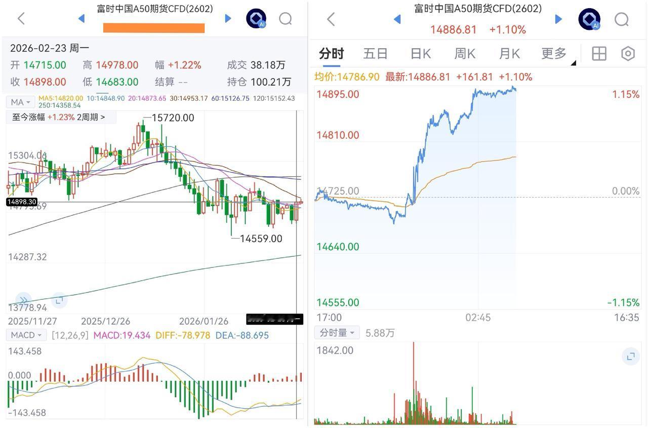 节日期间外盘表现之五(2月23日) 美最高法院裁决,对等关税取消;特朗普又引用122条款15%替代。整体来看,税率降低,利多A股。 港股大幅高开高走震荡,半导体、贵金属、汽车、光伏上涨,税率、中东局势影响正面 恒指:+2.53%; 国企:+2.65%; 科技:+3.34% 日韩股市 日经:休市;首综:+0.65% 夜盘美国低开震荡收红。大型科技股多上涨 谷歌+3.74%,甲骨文下跌-5.40%。 纳指:+0.90%; 道指:+0.47%; 标普:+0.60%。 依然震荡回调中。 富时A50期货 连续2天:+1.10%、+1.22% 连续上涨,预期向好 A股投资者心安,外盘利多 (图片源自网络侵权告知删除)