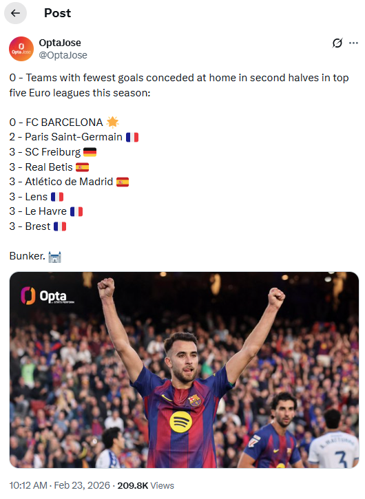 尽管在此之前巴萨一度遭遇两场客场失利,但球队在主场的表现依然稳定。自去年11月回到诺坎普以来,巴萨在主场保持不败。更值得一提的是,巴萨目前成为五大联赛中唯一一支在联赛主场比赛下半场仍保持零失球的球队。
