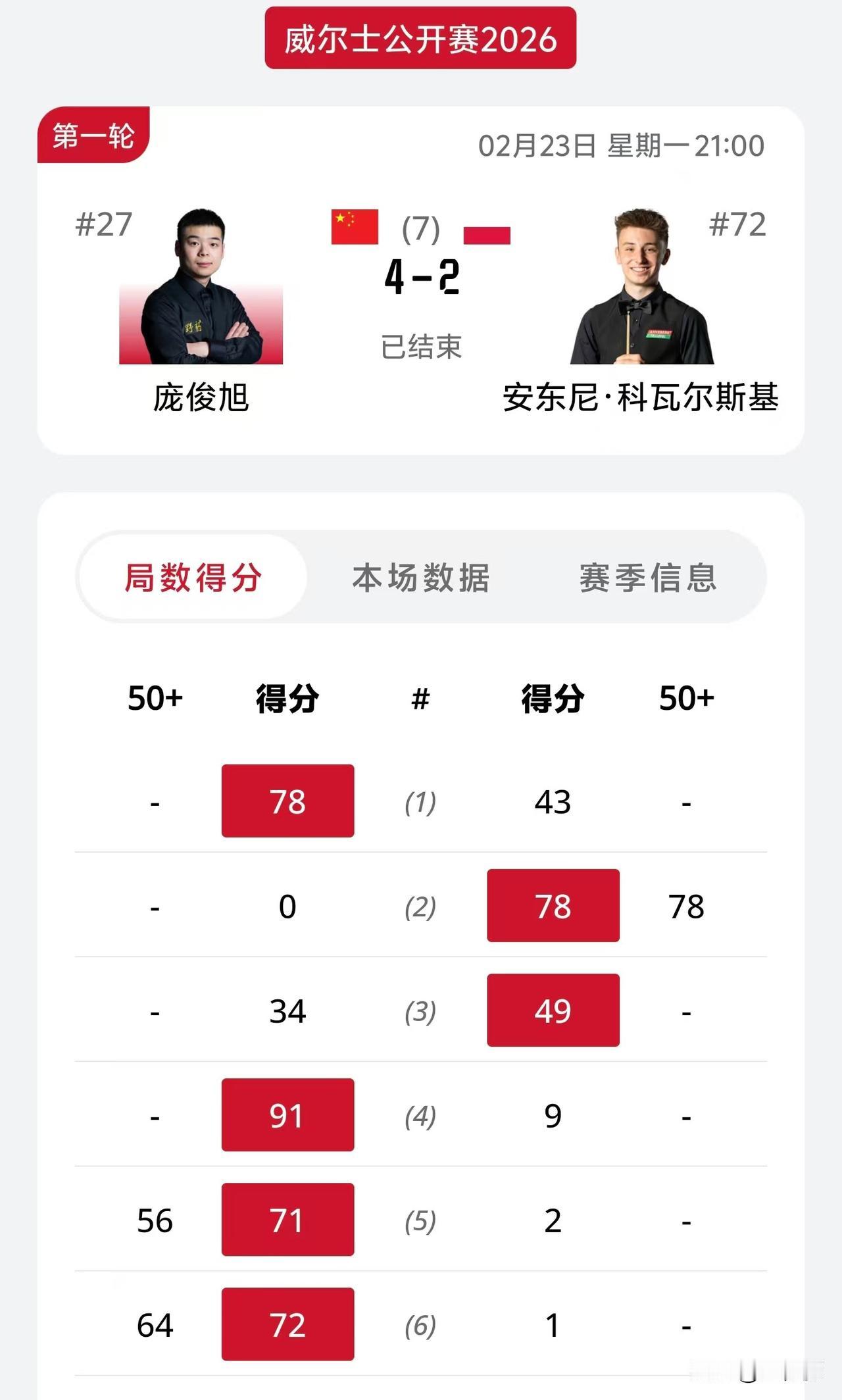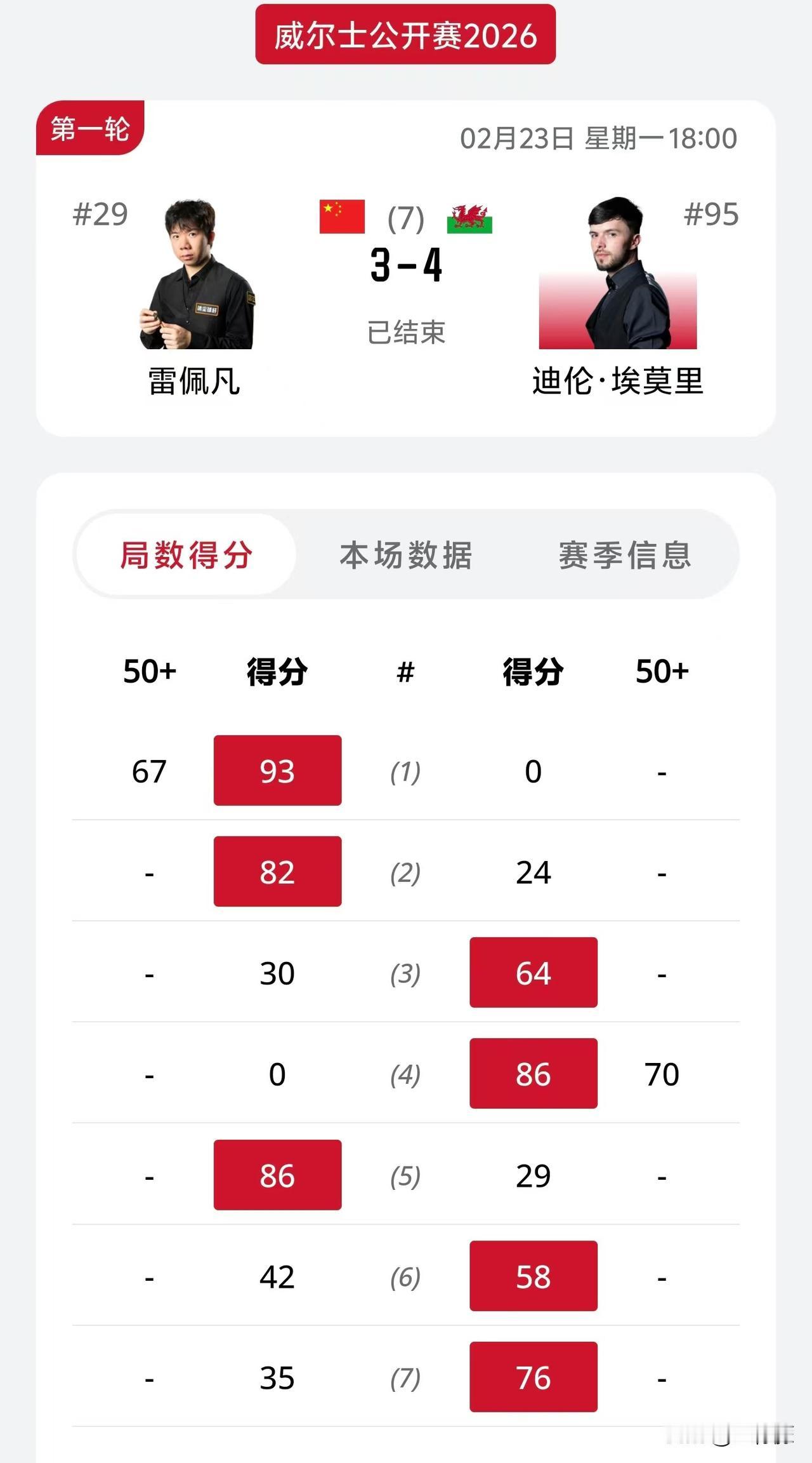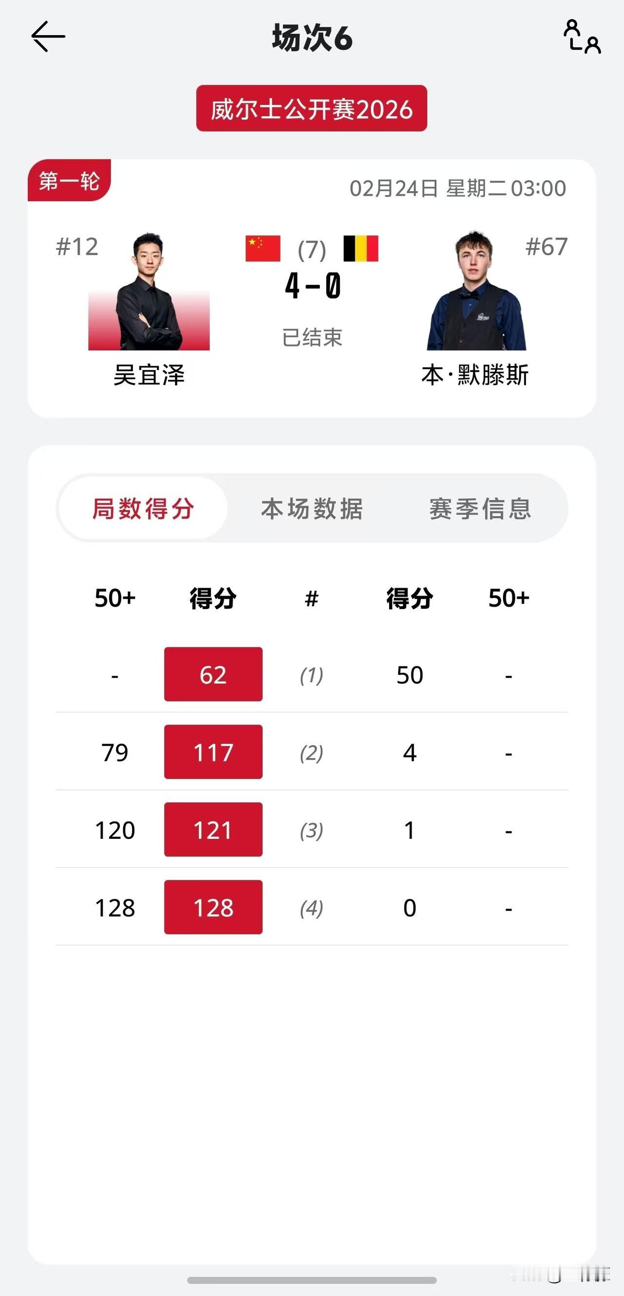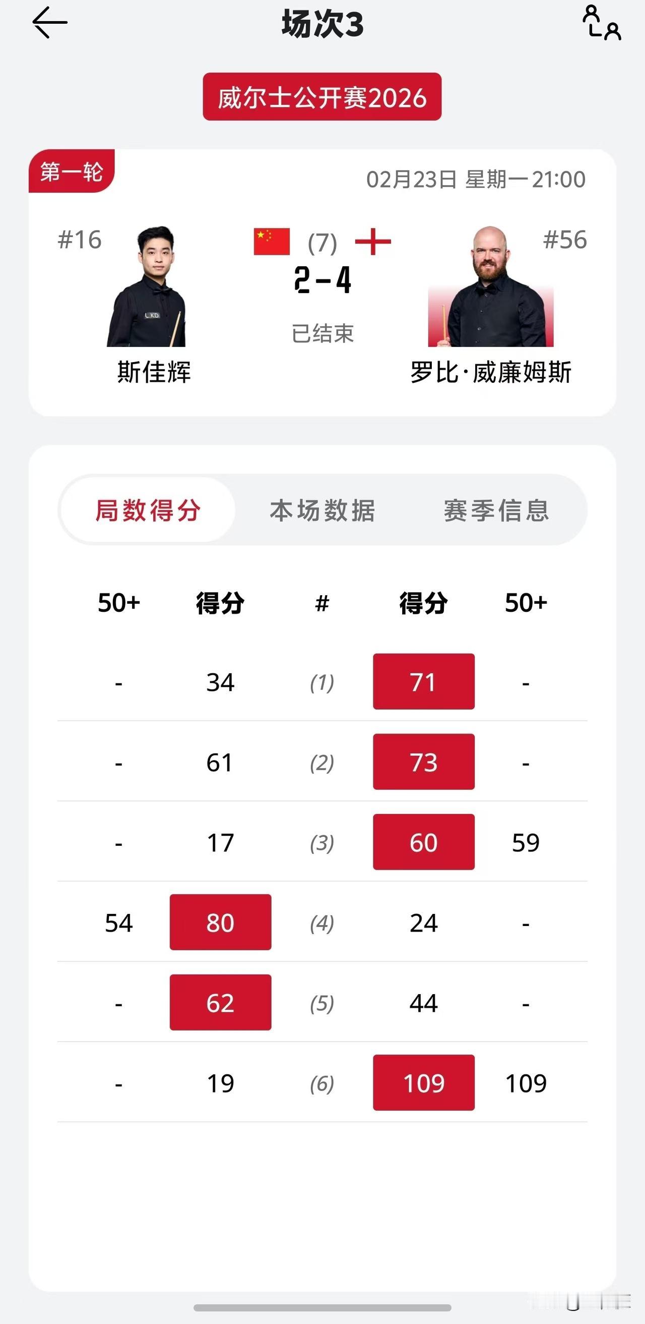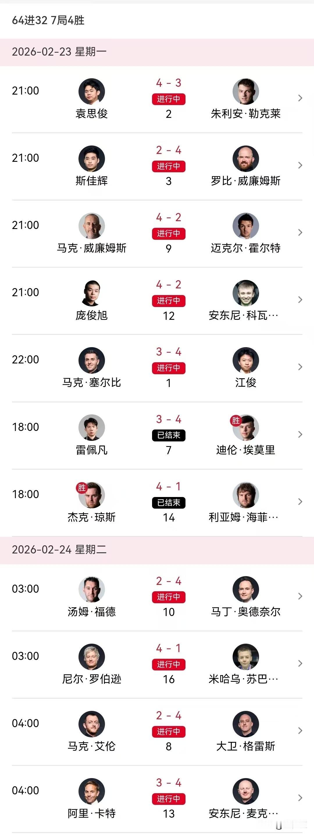 威尔士公开赛|爆冷!卫冕冠军塞尔比一轮游!中国小将江俊4-3绝杀塞尔比 北京时间2月23讯,斯诺克 威尔士公开赛2026正赛第一天的比赛(64进32)结束,卫冕冠军塞尔比一轮游!中国小将江俊1-3落后,连扳三局4-3绝杀塞尔比,晋级32强。同时晋级32强的中国选手有袁思俊(4-3朱利安)、庞俊旭(4-2安东尼)、吴宜泽(4-0默滕斯)。 中国选手雷佩凡3-4埃默里,斯佳辉2-4罗比·威廉姆斯,无缘32强。 名将马克·艾伦2-4格雷斯,卡特3-4麦克吉尔,一轮游。 2026斯诺克威尔士公开赛 斯诺克大冷门