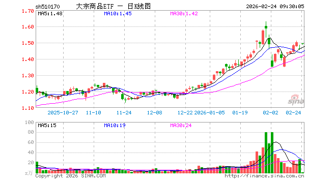 2月24日,大宗商品ETF(510170)开盘涨2.19%,报1.495元。大宗商品ETF(510170)重仓股方面,江西铜业开盘涨3.38%,恒力石化涨1.75%,白银有色涨6.44%,厦门钨业涨4.22%,华鲁恒升涨1.49%,紫金矿业涨4.53%,中国巨石涨6.10%,金钼股份涨2.96%,南山铝业涨2.39%,山东黄金涨4.07%。