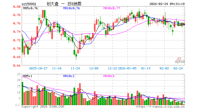 2月24日,创大盘ETF(159991)开盘涨0.27%,报0.754元。创大盘ETF(159991)重仓股方面,宁德时代开盘涨2.00%,中际旭创涨2.07%,新易盛涨0.52%,东方财富涨0.54%,阳光电源涨1.74%,胜宏科技涨1.59%,汇川技术涨2.54%,迈瑞医疗涨1.10%,天孚通信涨5.27%,亿纬锂能涨1.80%。