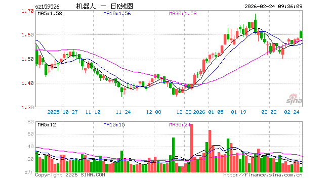 2月24日,机器人ETF嘉实(159526)开盘涨1.83%,报1.611元。机器人ETF嘉实(159526)重仓股方面,科大讯飞开盘涨2.24%,汇川技术涨2.54%,拓普集团涨1.78%,大华股份涨0.95%,大族激光涨0.42%,双环传动涨3.12%,石头科技涨1.48%,中控技术涨1.84%,绿的谐波涨0.02%,机器人涨3.15%。