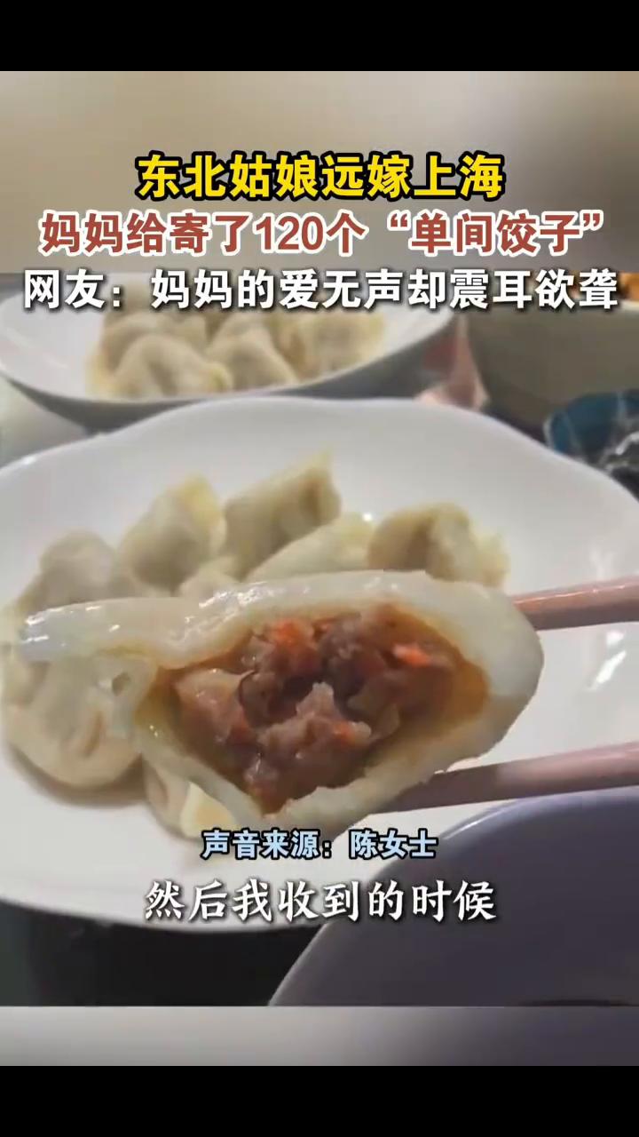 东北姑娘远嫁上海,妈妈给寄了120个"单间饺子"。网友:妈妈的爱无声却震耳欲聋。 冀时。 2月23日(采访),上海。过年没回去,所以我妈就给我寄了她自己包的饺子。比较担心这个饺子在路上会化成一坨,所以她就把4个饺子装一袋,每一个饺子之间用绳子系上。我收到的时候饺子冻得很好,一点都没有化。挺感动的,过年能吃到家里的饺子,特别开心。