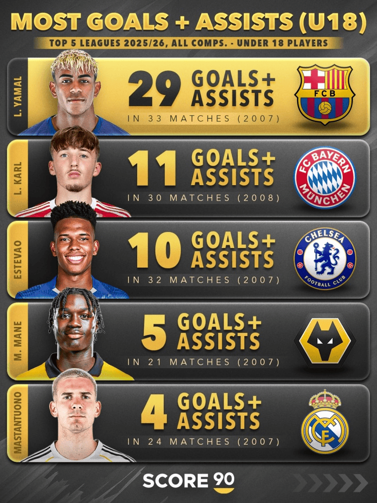 虎扑02月24日讯Score90统计了本赛季五大联赛U18球员在各项赛事的参与进球情况,详情如下: