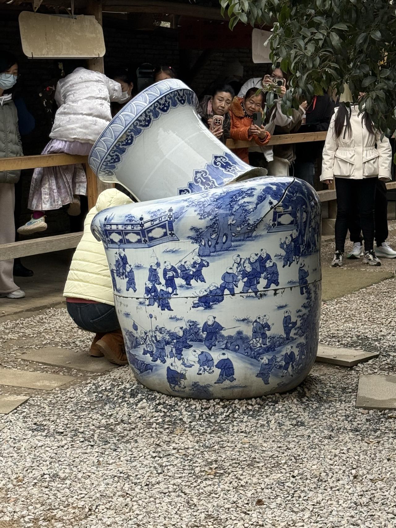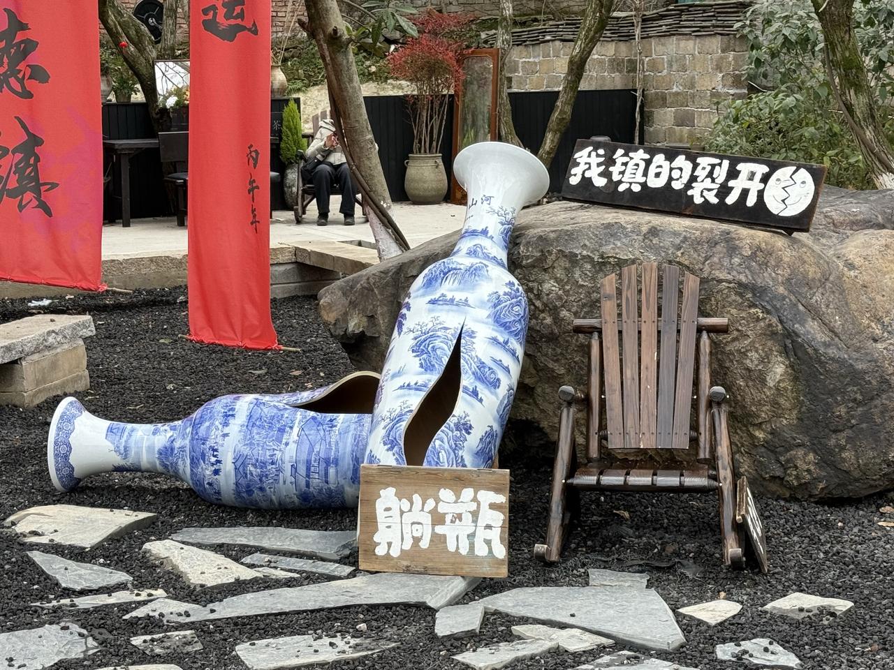 三宝村,要是不挤人还是蛮不错的!真的避雷三宝村!全是人、这几张照片全是抓拍没人的时候😭 没去之前以为是热闹的集市,到了才发现就是一个改造过的村庄,道路两旁全是咖啡店、陶瓷店,还有各种带景德镇字样的网红打卡点,人挤人根本没法好好拍。 我们打车依次去了9494美学空间、有树咖啡、无语咖啡,还有网红的受气瓶、躺赢瓶。路上有很多电动车出租,30块钱一天,我们是全程走路的,如果想一路打卡拍照,建议直接租电动车,省时又省力。 受气瓶排队的人超级多,我们果断放弃了。如果只是单纯冲受气瓶和躺赢瓶打卡,建议直接打车到点位,早点去就能不用排队。 三宝村几乎每个打卡点都在大排长队,拍完就赶紧撤了! 三宝村 受气瓶